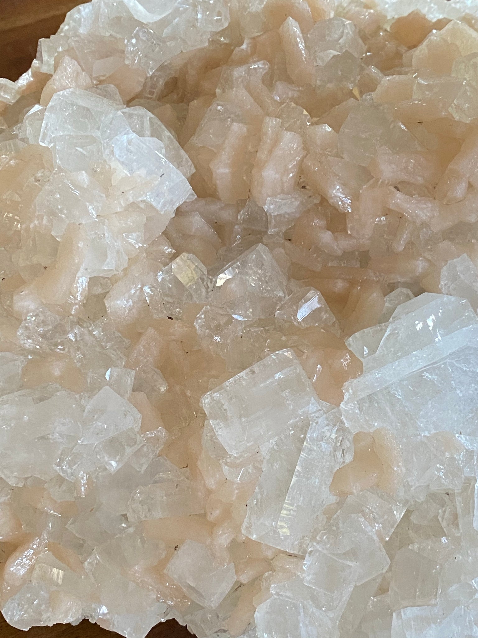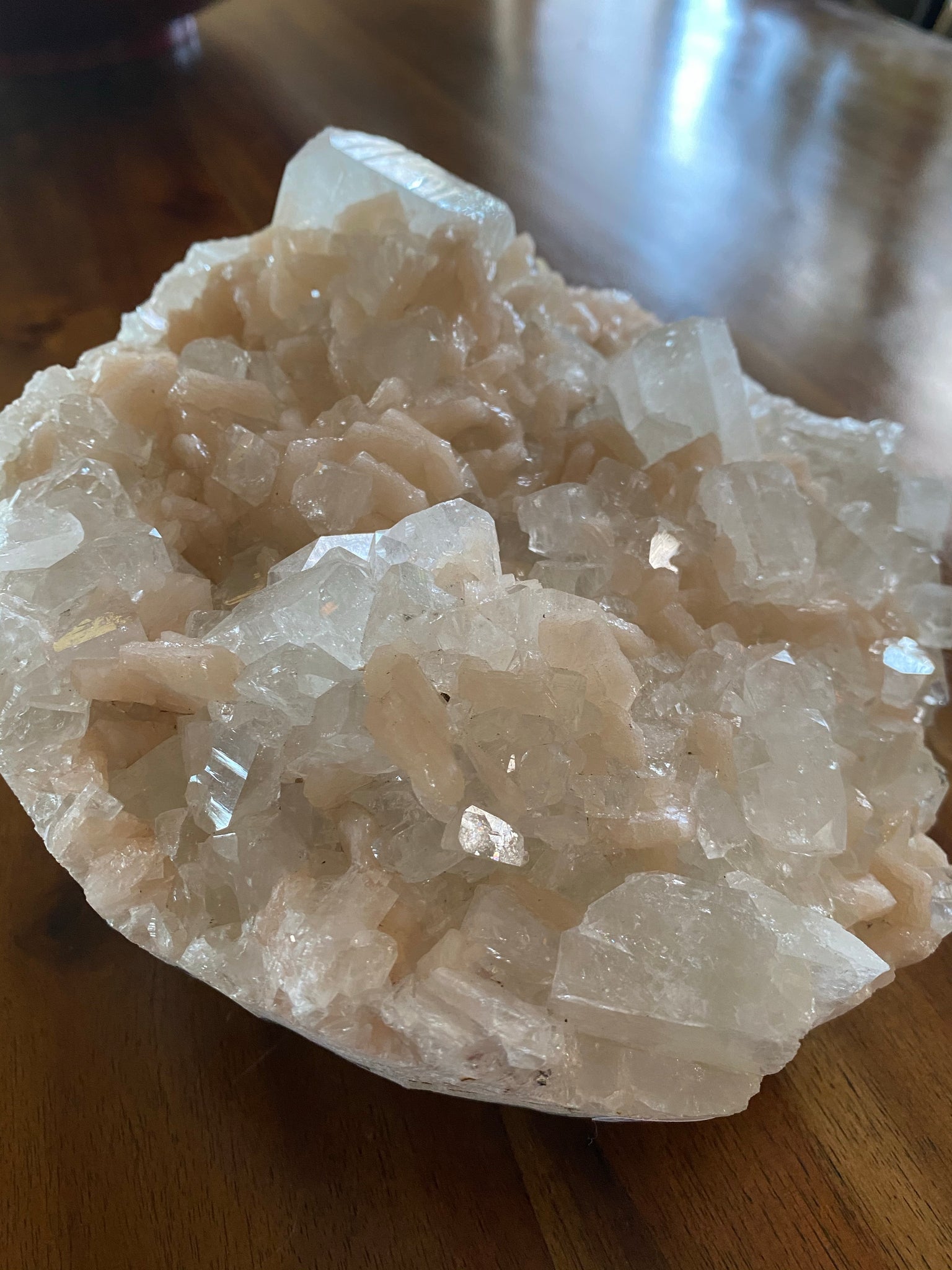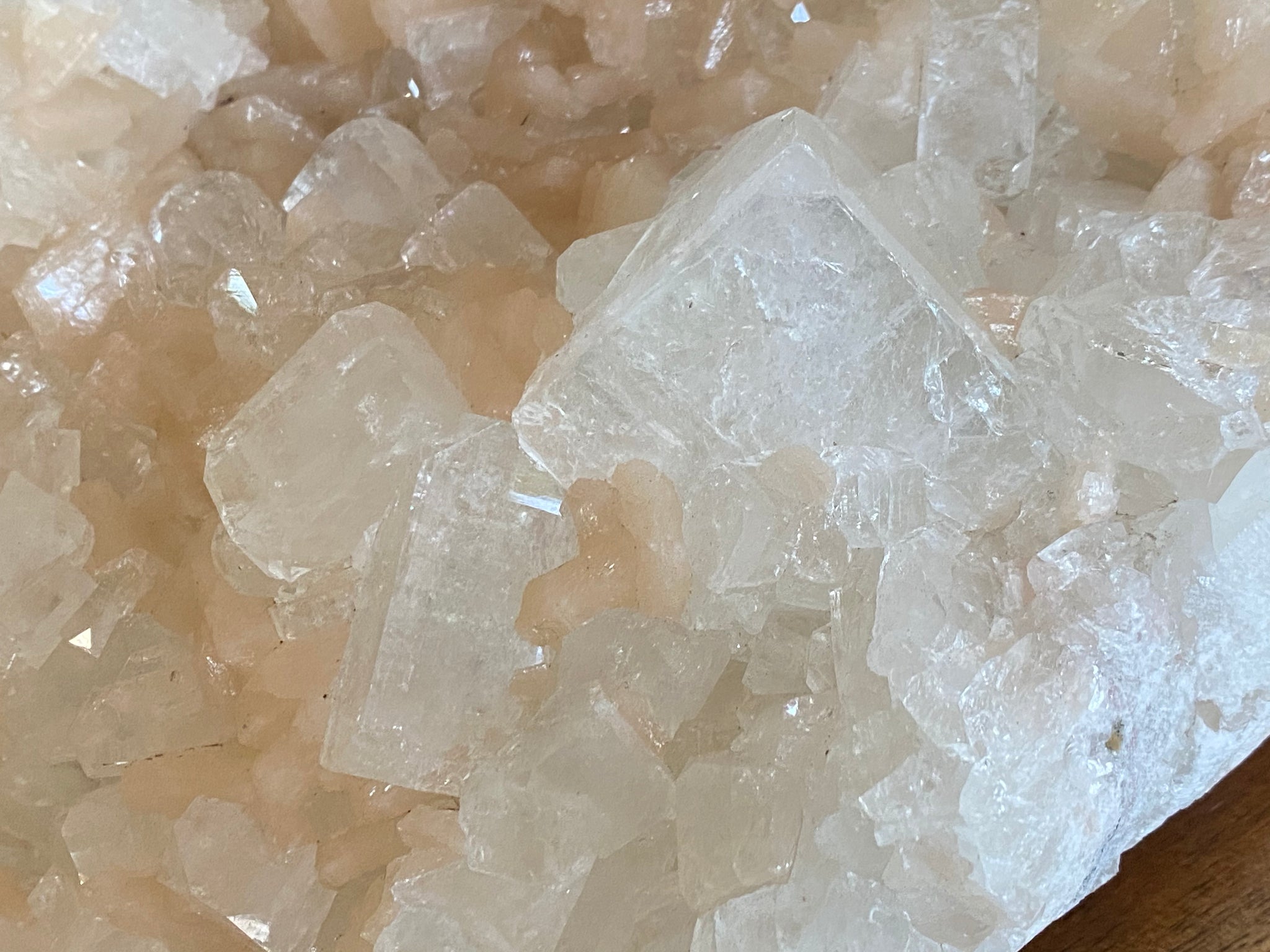This XXL Apophyllite and Apricot Stilbite cluster is just like a sparkly fairy garden, the pictures truly don’t capture the magic it’s vibrating. Displaying the perfect ratio of Stilbite/Apophyllite to give the perfect balance to this unique specimen.