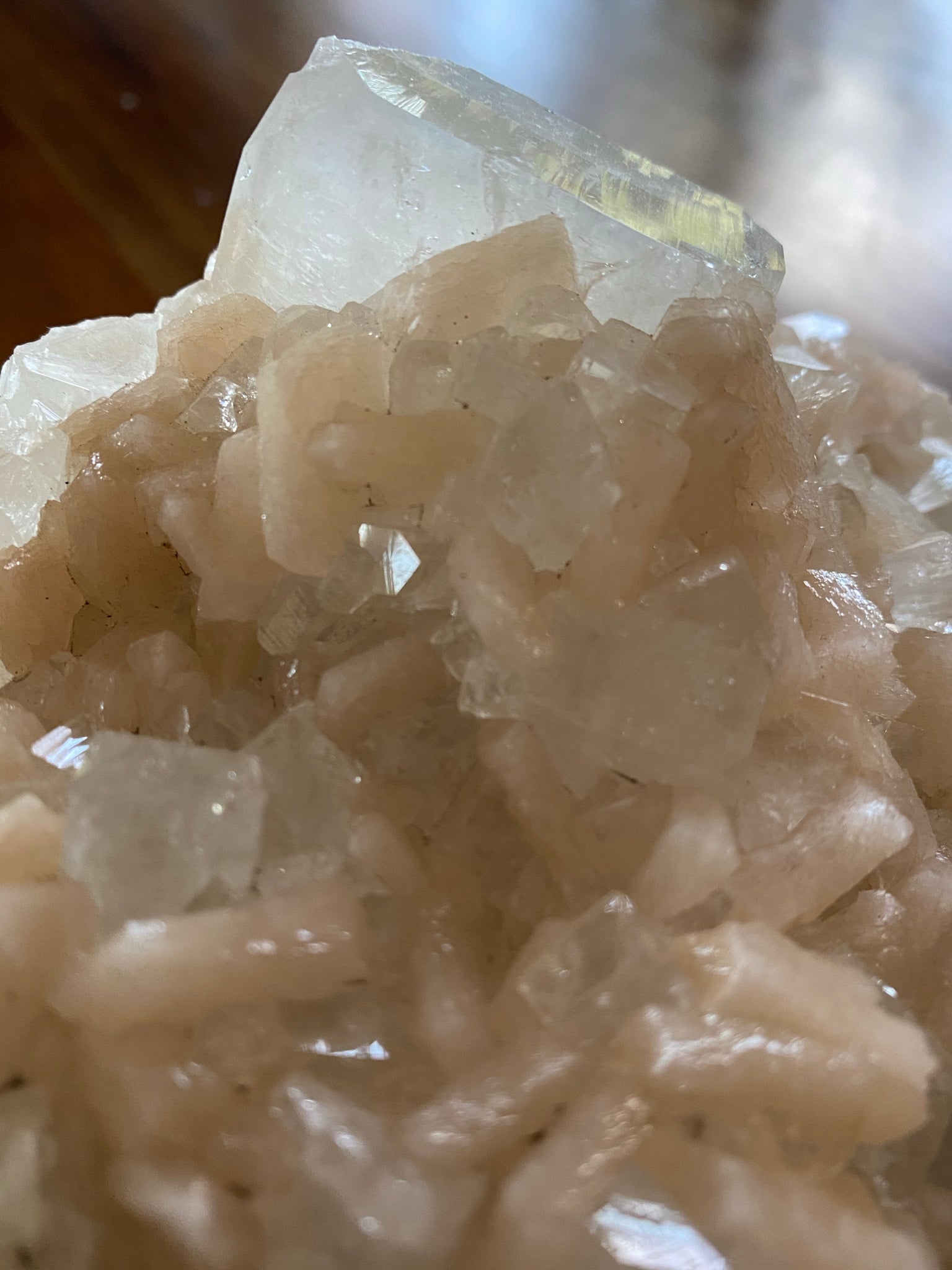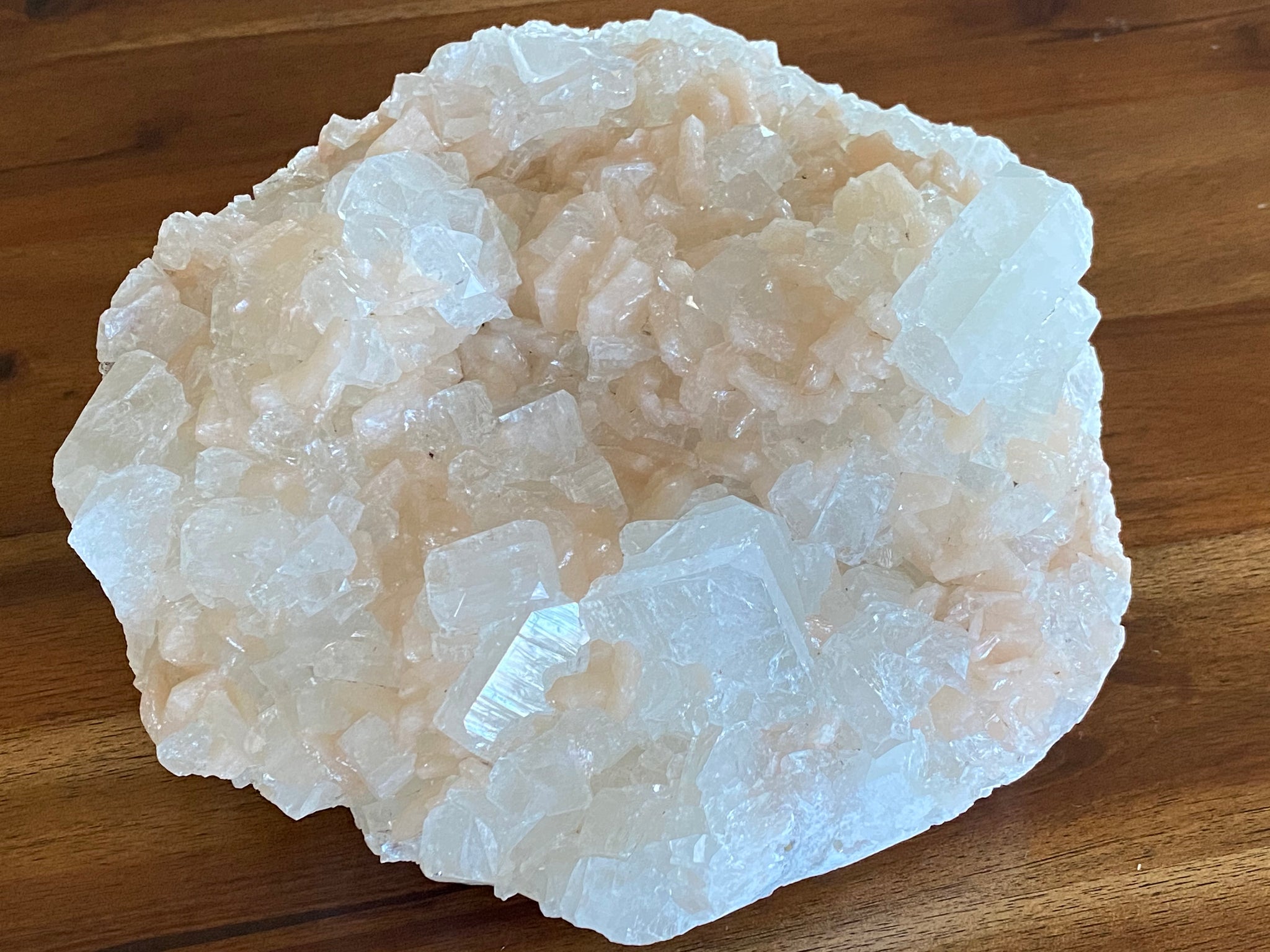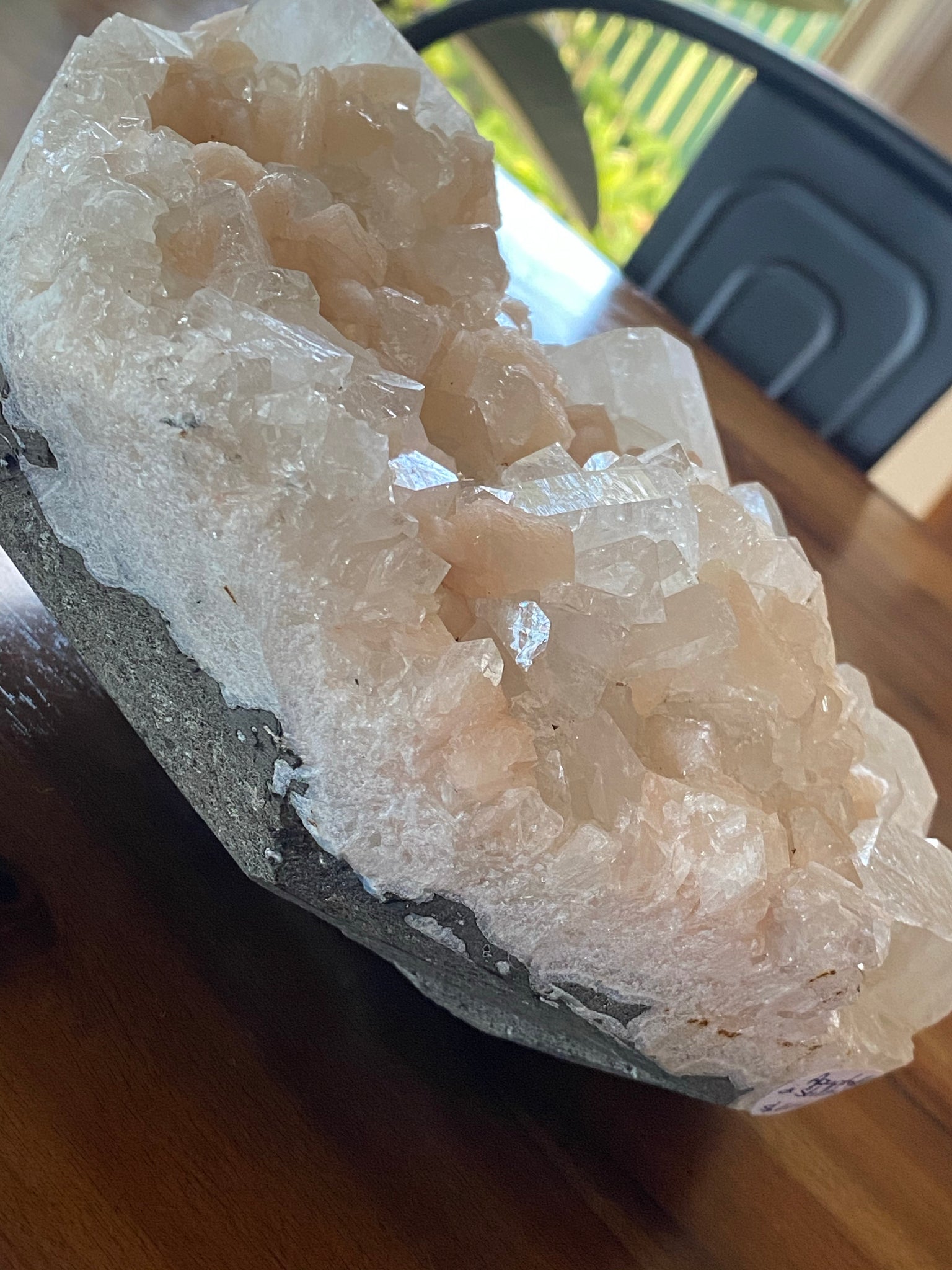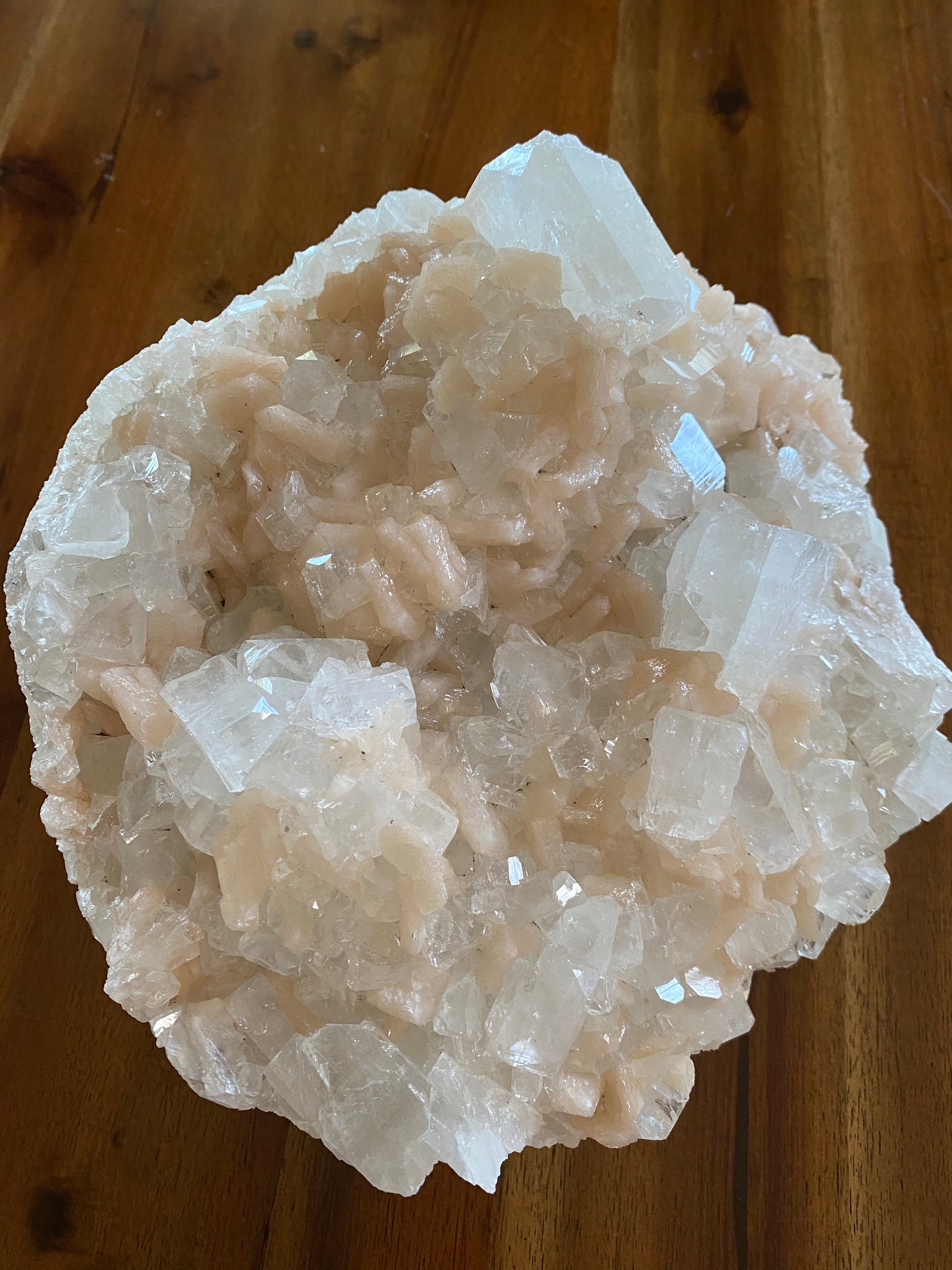 This XXL Apophyllite and Apricot Stilbite cluster is just like a sparkly fairy garden, the pictures truly don’t capture the magic it’s vibrating. Displaying the perfect ratio of Stilbite/Apophyllite to give the perfect balance to this unique specimen.