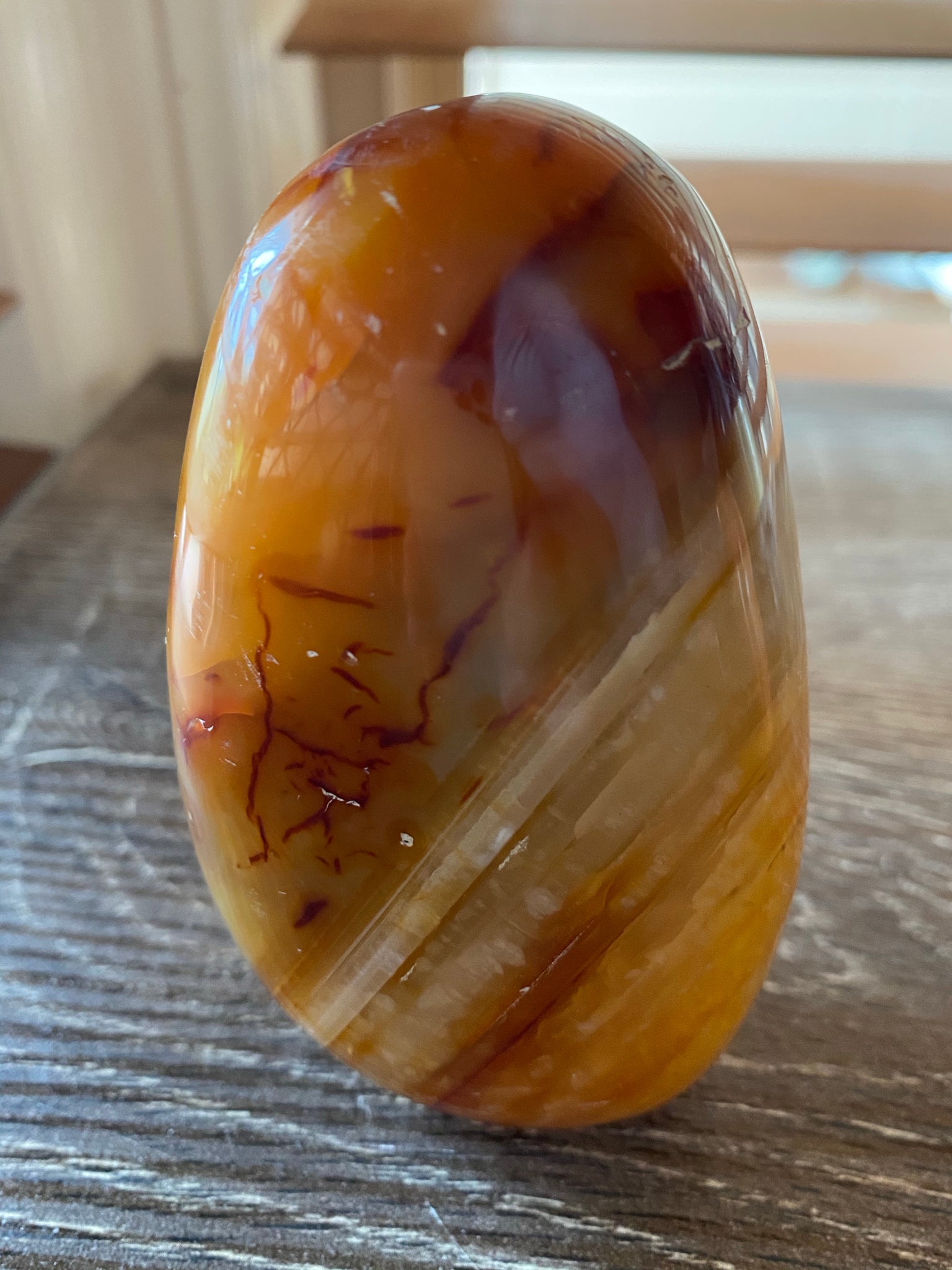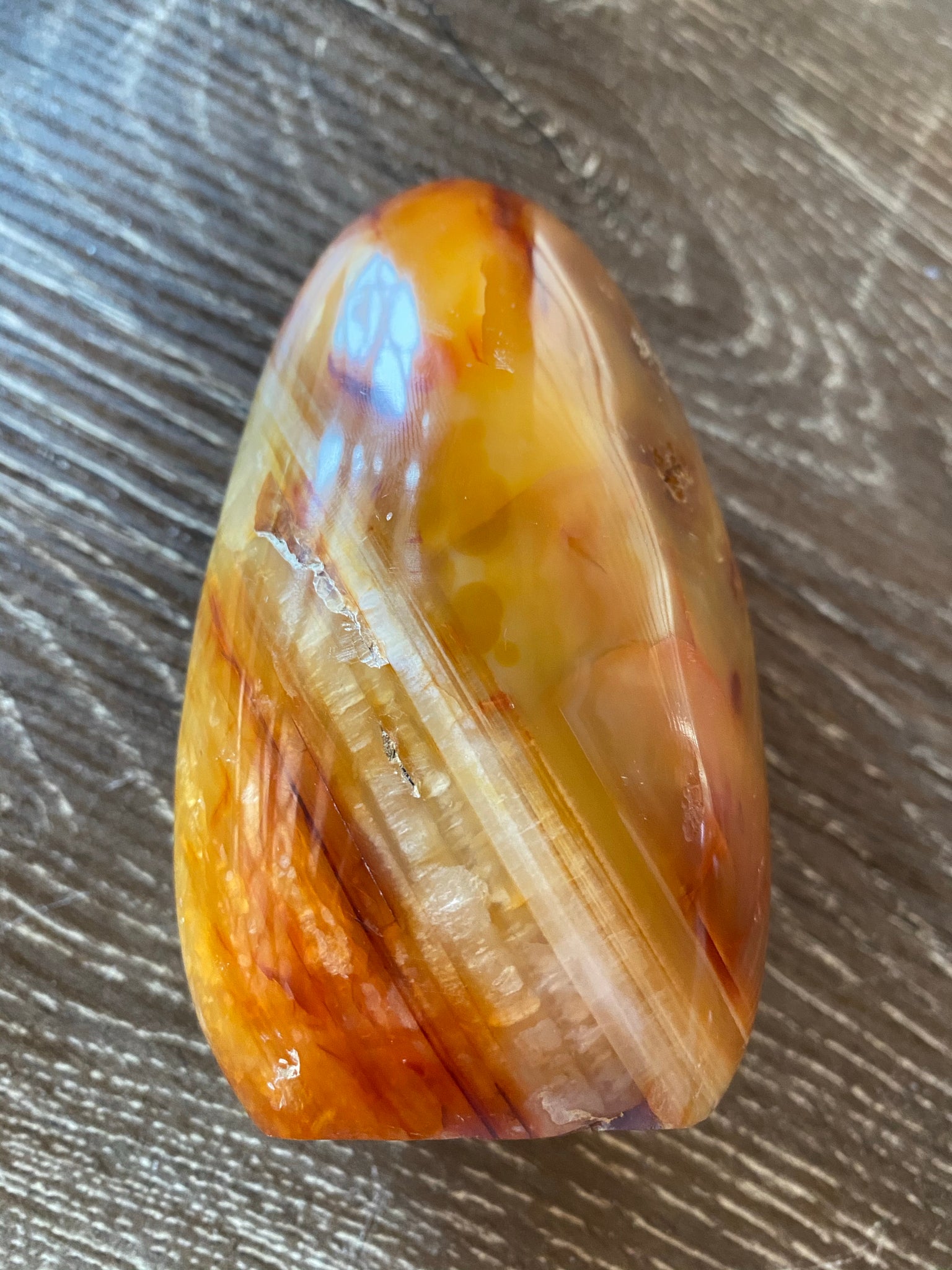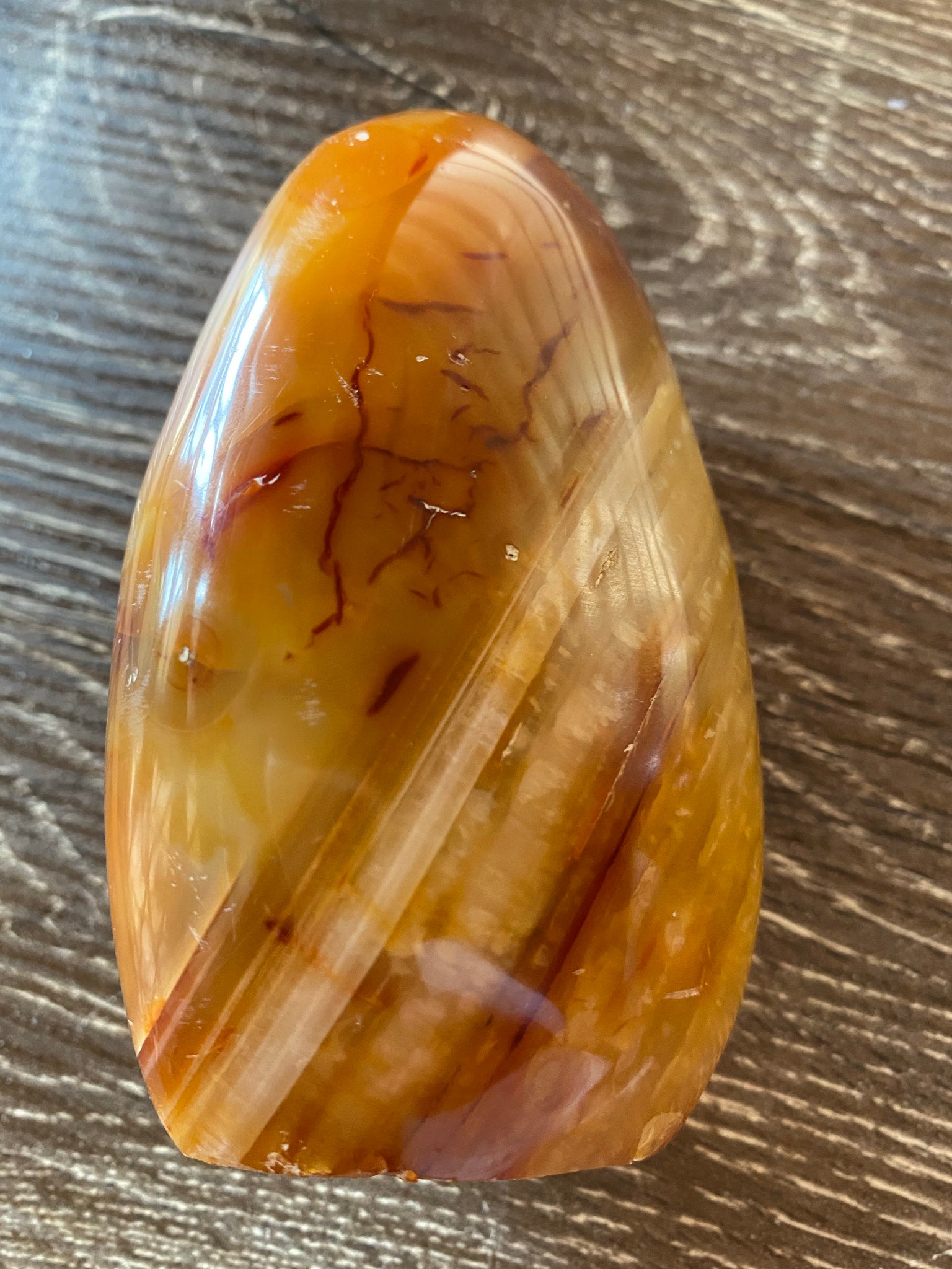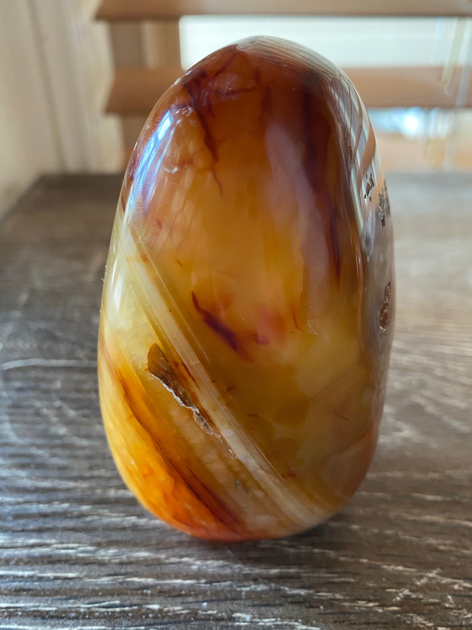 This warming, excellent quality polished freeform Carnelian is silky smooth to touch and displays a full range of different shades of orange. Weighing 405.15 grams, measuring 11cm H x 8cm W x 17 cm C.