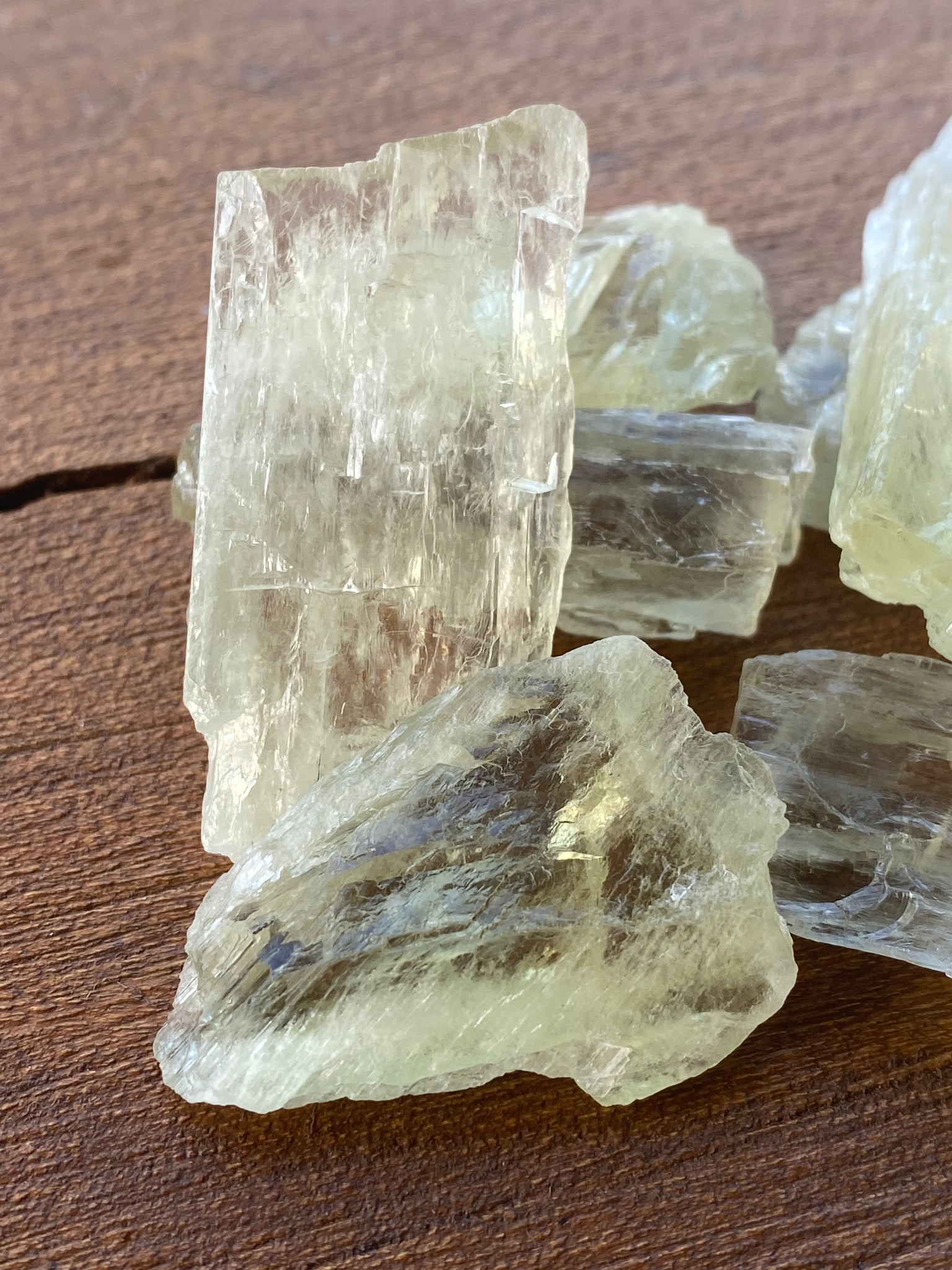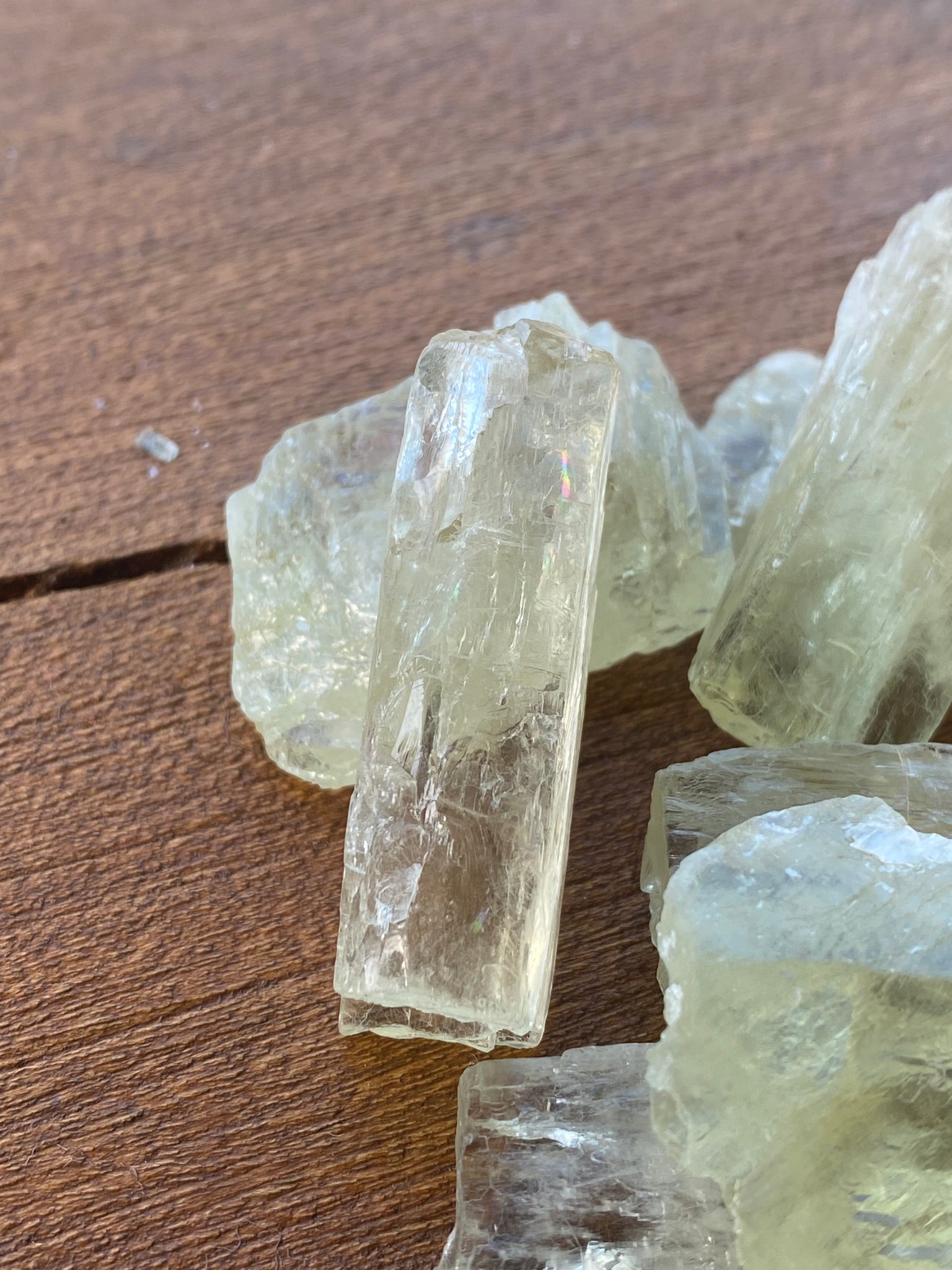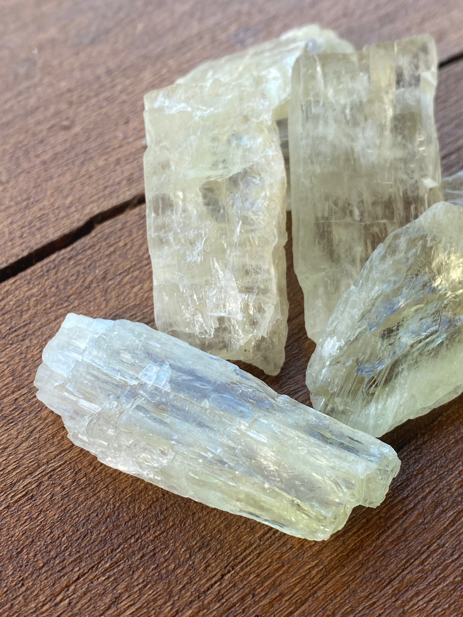 Hiddenite is also known as Green Spodumene, or Green Kunzite. These stunning raw specimens come from Brazil and display the softest greenish yellow colour with many hidden rainbows. They are an excellent quality and a very good size measuring 4 - 5cm each.