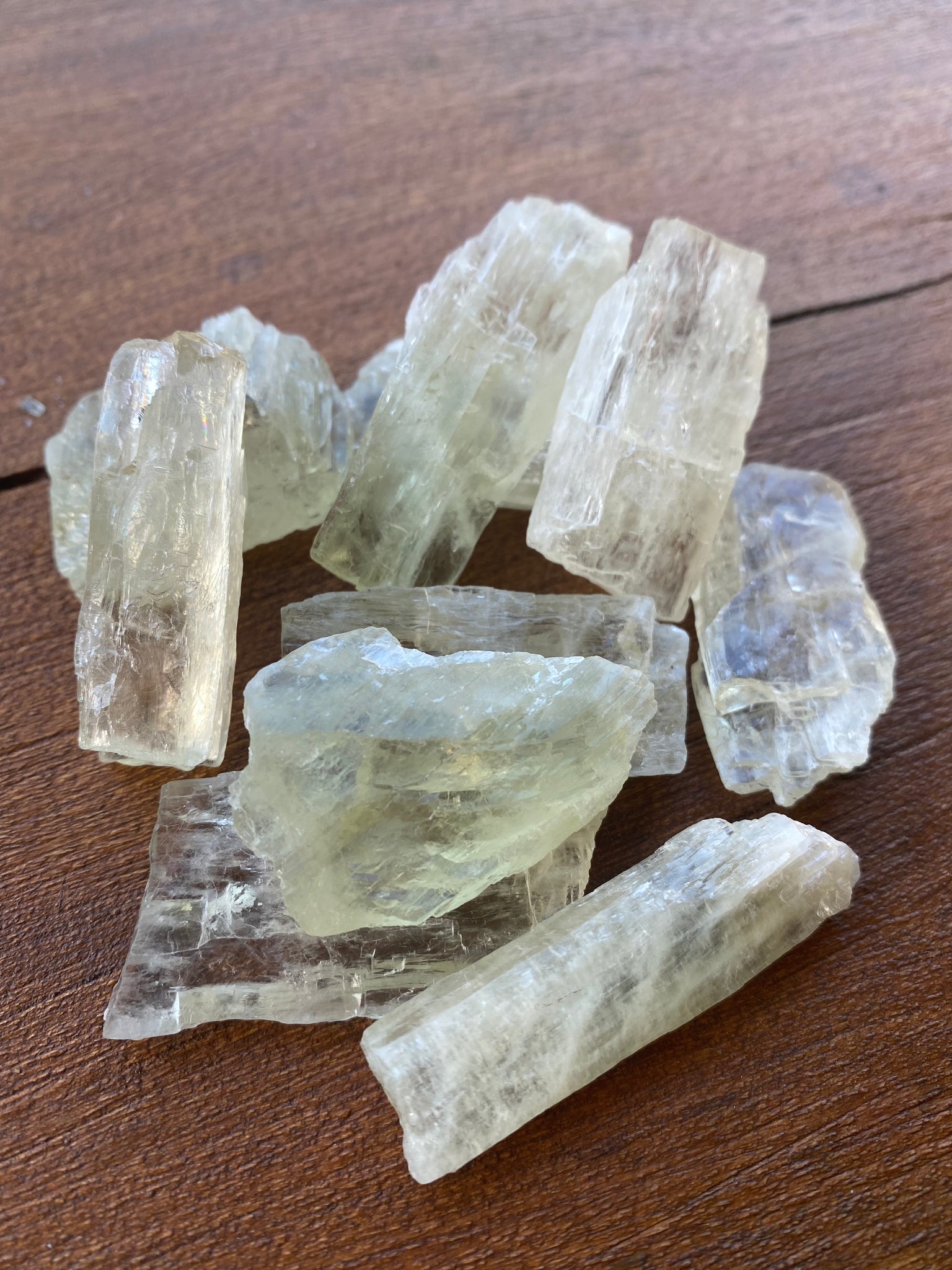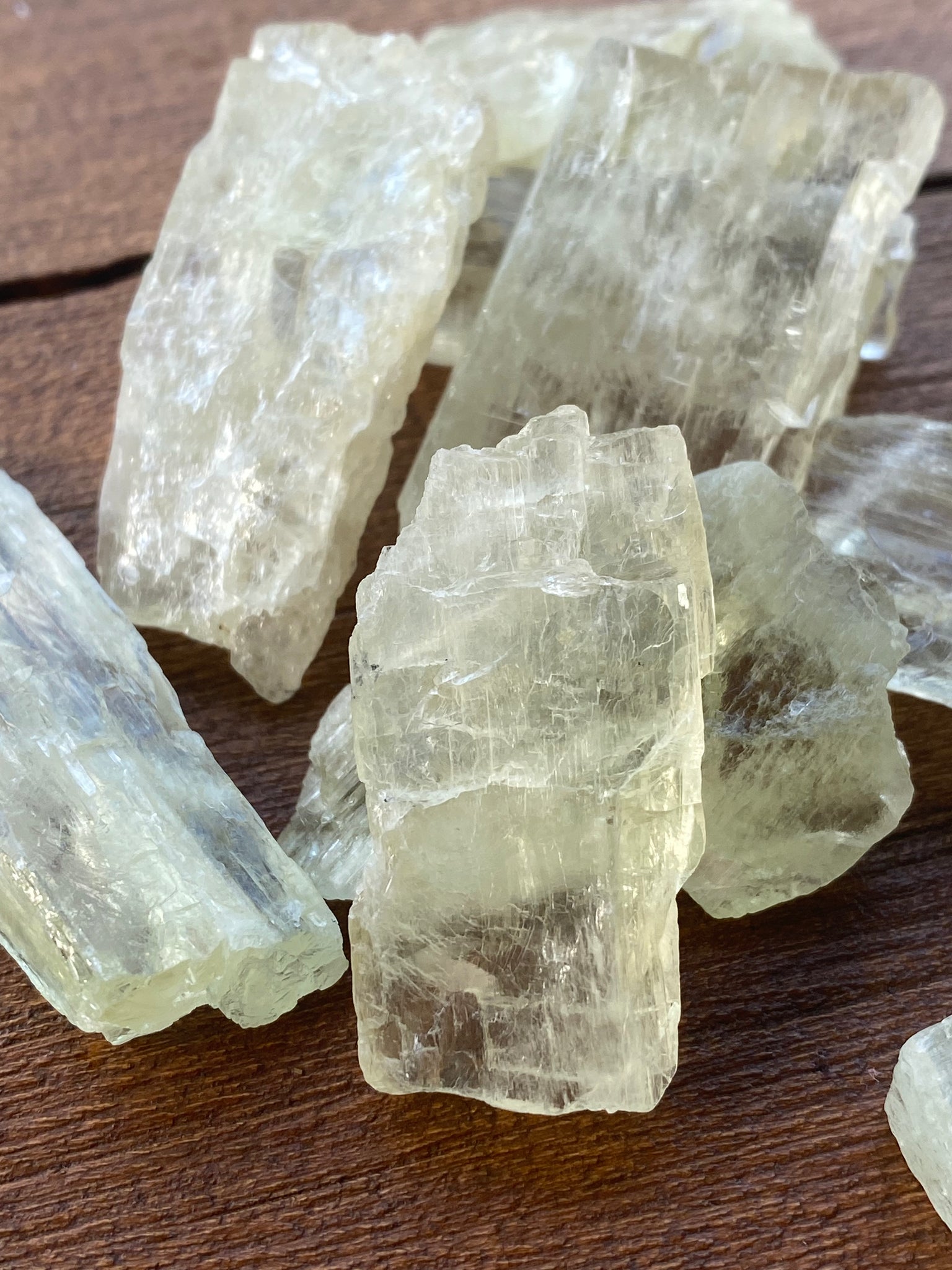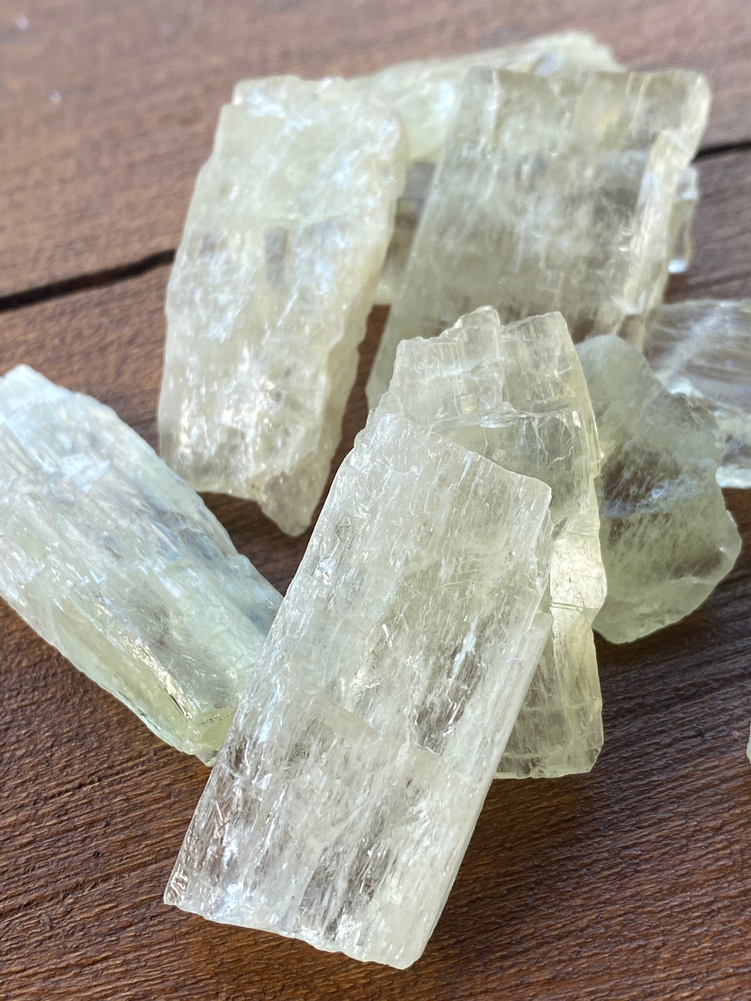 Hiddenite is also known as Green Spodumene, or Green Kunzite. These stunning raw specimens come from Brazil and display the softest greenish yellow colour with many hidden rainbows. They are an excellent quality and a very good size measuring 4 - 5cm each.