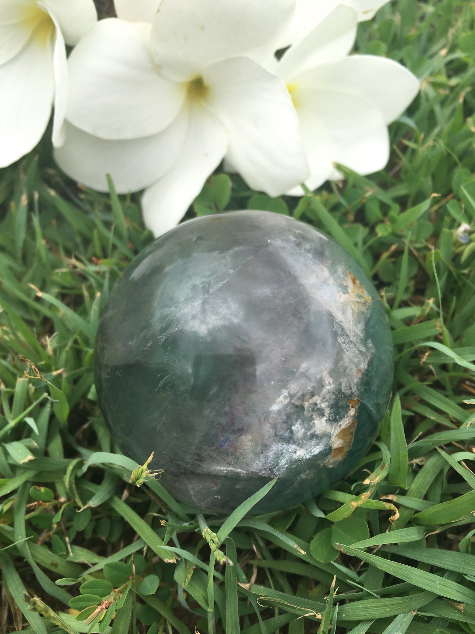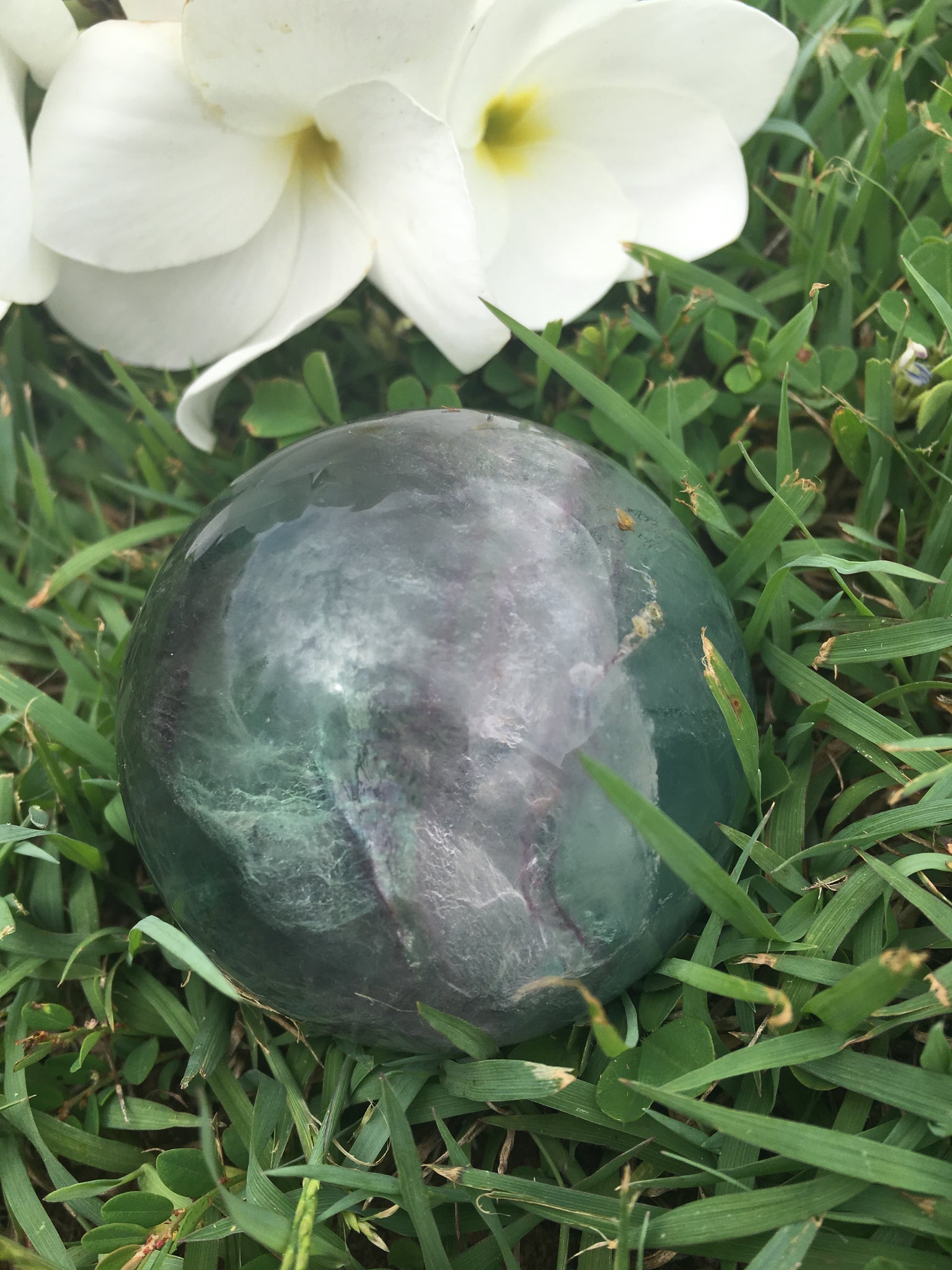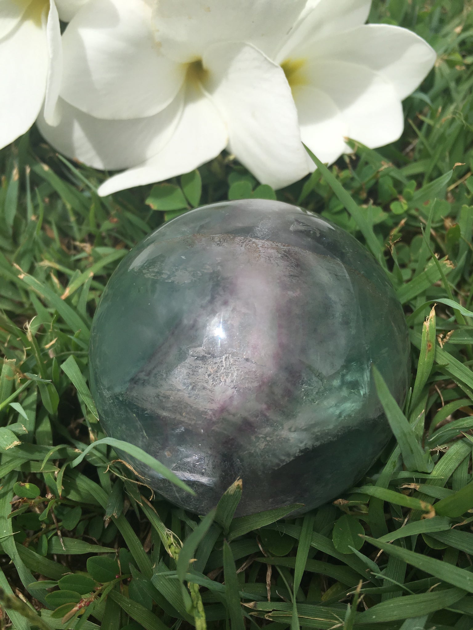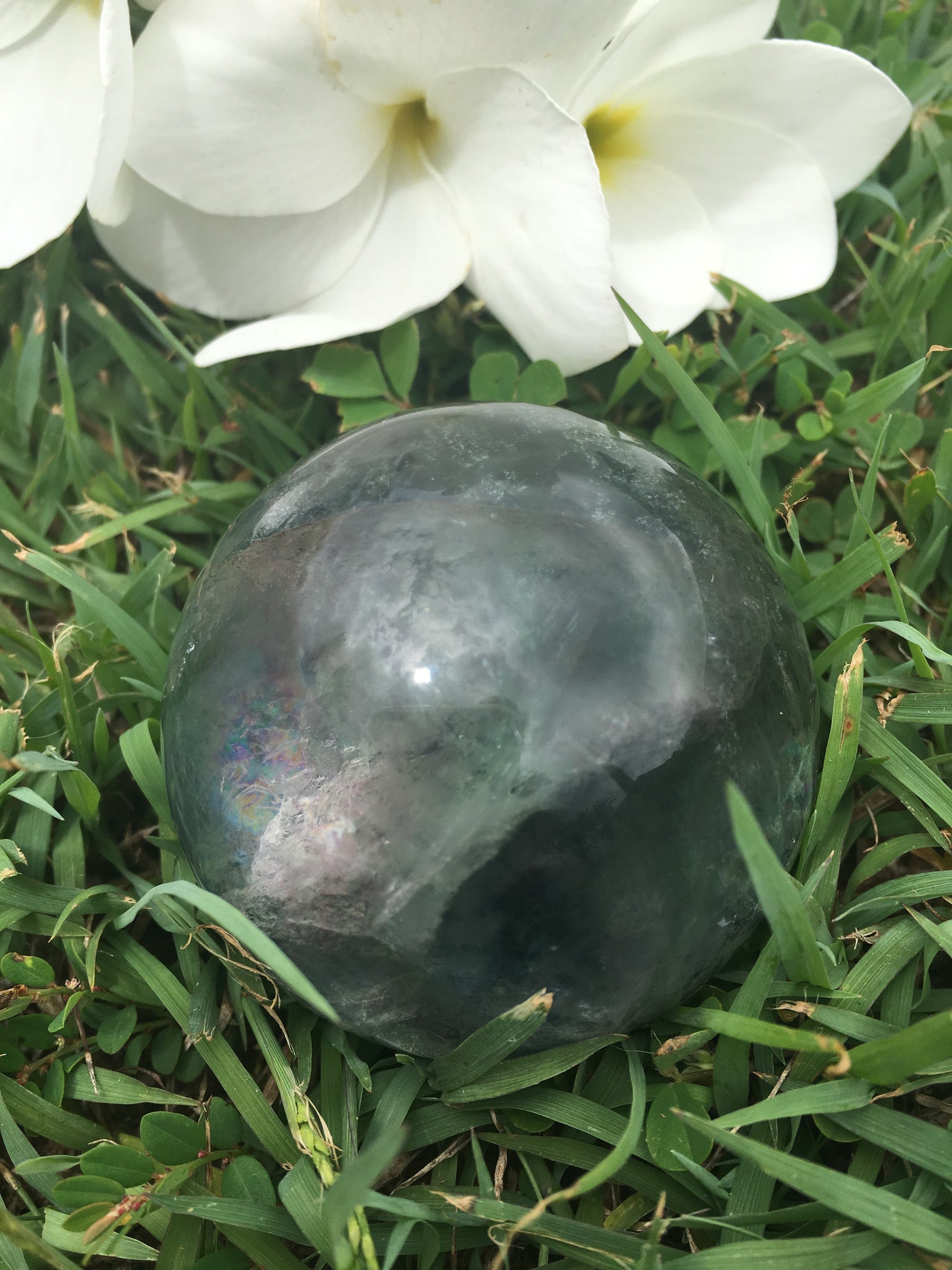 Sphere circumference is approx 18cm. Very High Grade Fluorite. Light cool Texture and Vibration throwing lots of rainbows and deep windows for gazing the mind into.