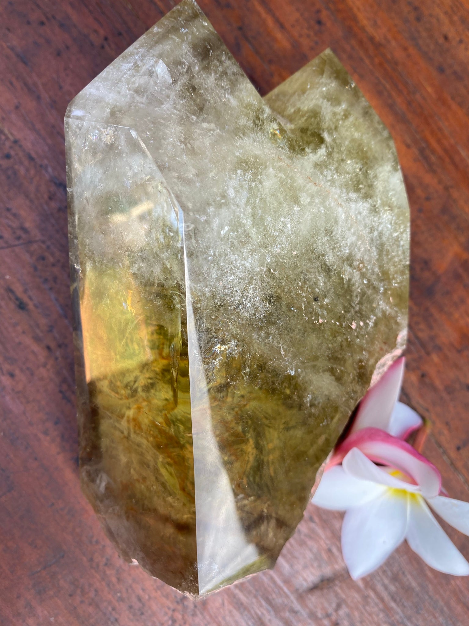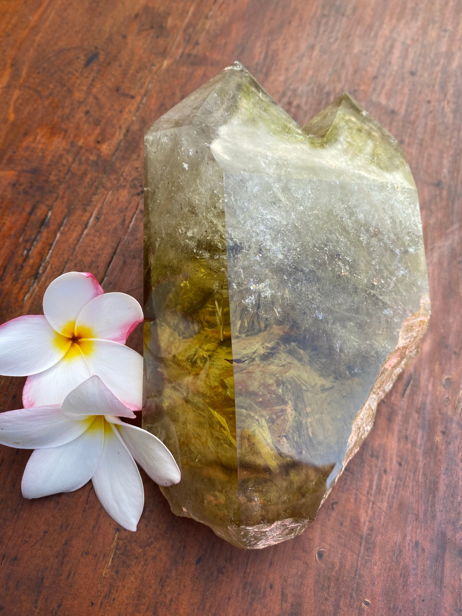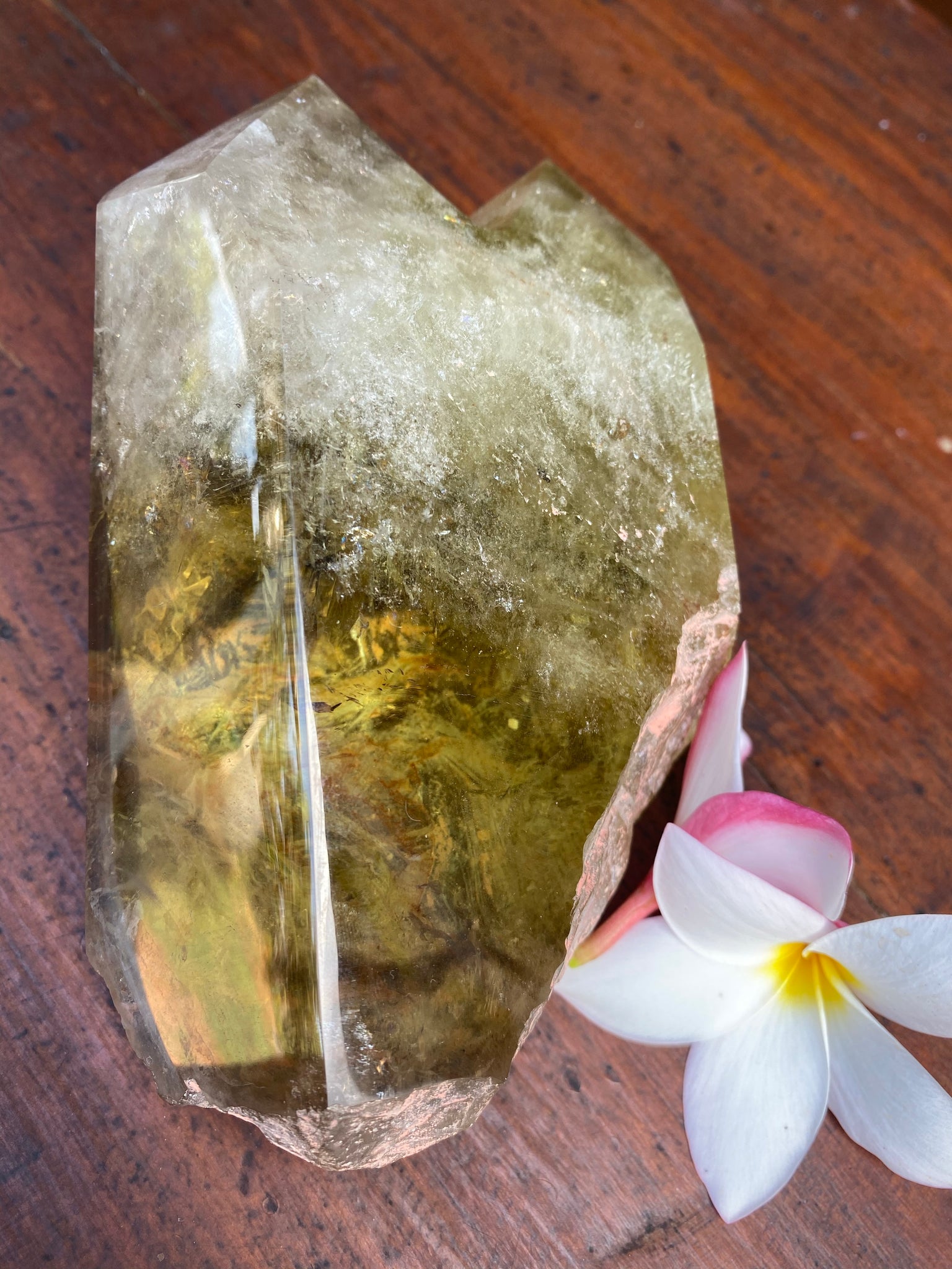This Large Smokey Quartz Citrine Crystal is very different, displaying the perfect balance of yin Yang energies. The points are cloudy and busy and display really strong phantoms of Smokey but the middle and base is so so clear like an endless pool of yellow bliss. I am truly speechless at its beauty, balance and clarity. Weighing well over a kilo @ 1154.4 grams and measuring L 17 cm x W 12cm x C 26.5cm.