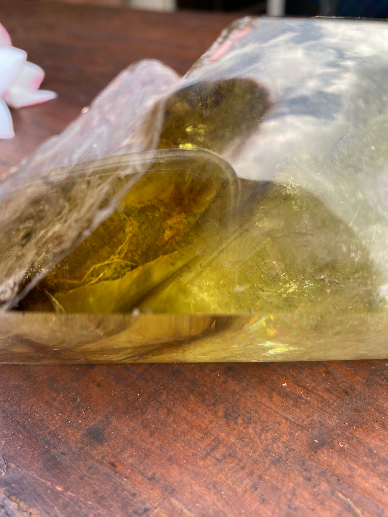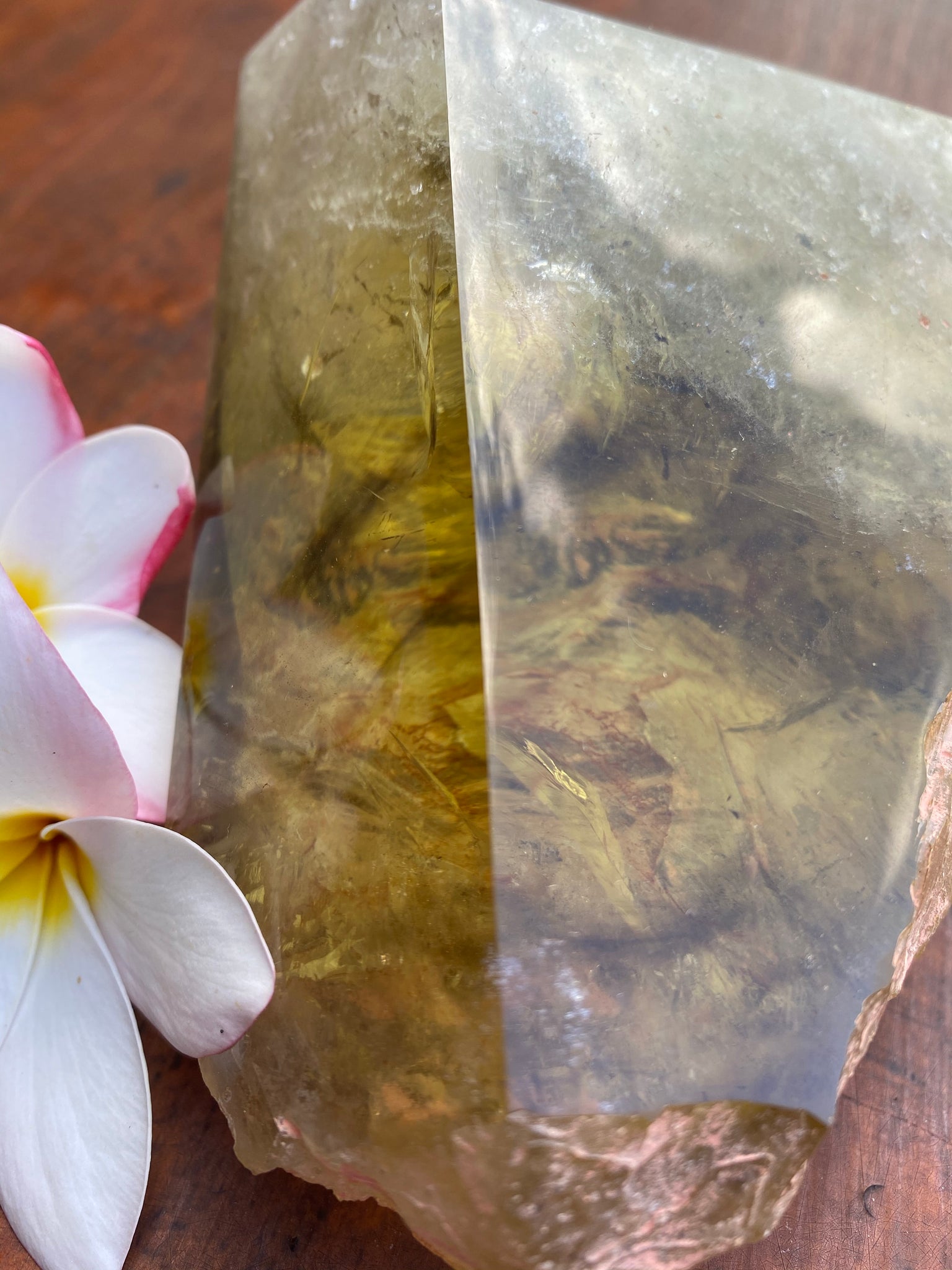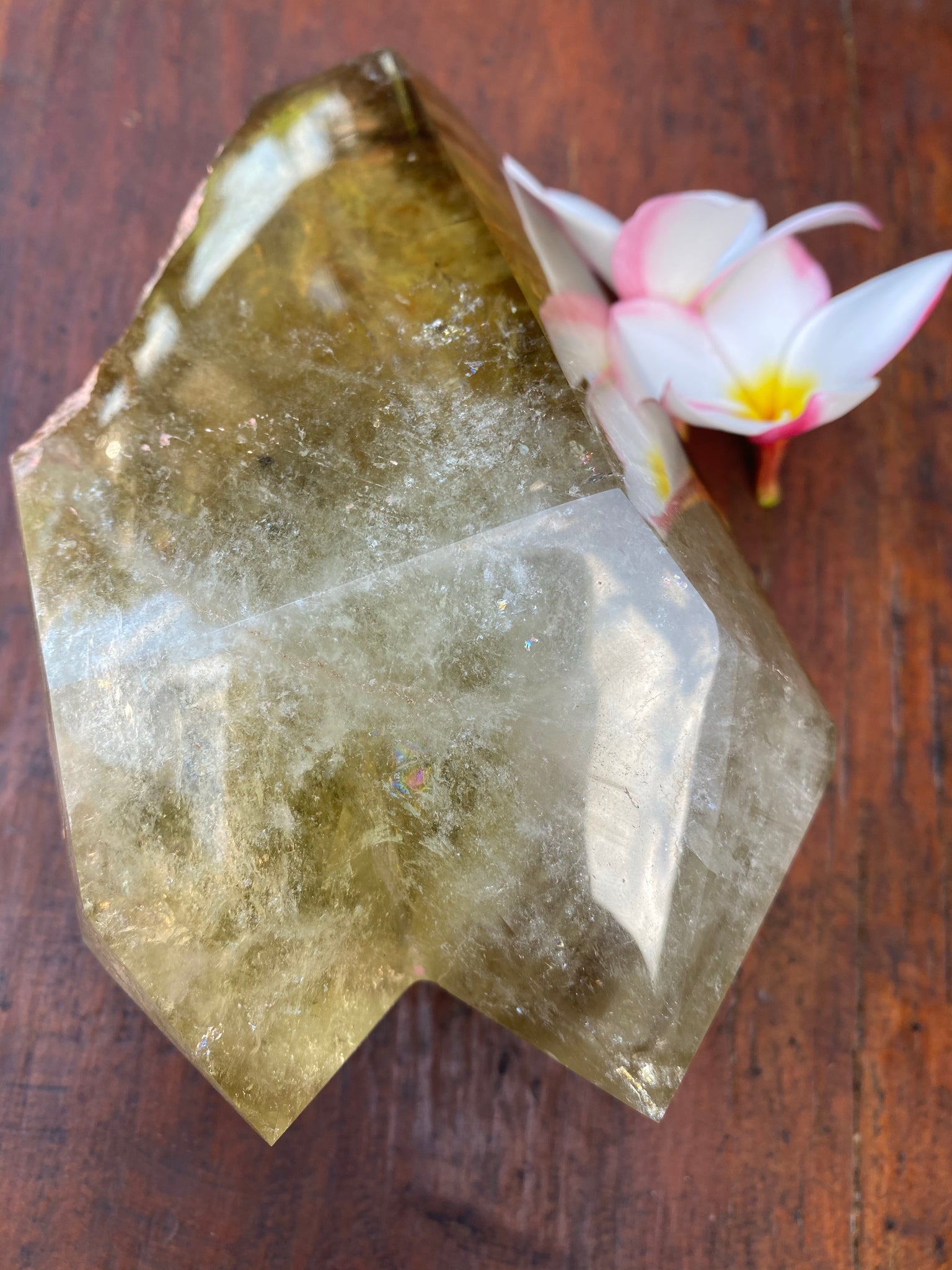 This Large Smokey Quartz Citrine Crystal is very different, displaying the perfect balance of yin Yang energies. The points are cloudy and busy and display really strong phantoms of Smokey but the middle and base is so so clear like an endless pool of yellow bliss. I am truly speechless at its beauty, balance and clarity. Weighing well over a kilo @ 1154.4 grams and measuring L 17 cm x W 12cm x C 26.5cm.