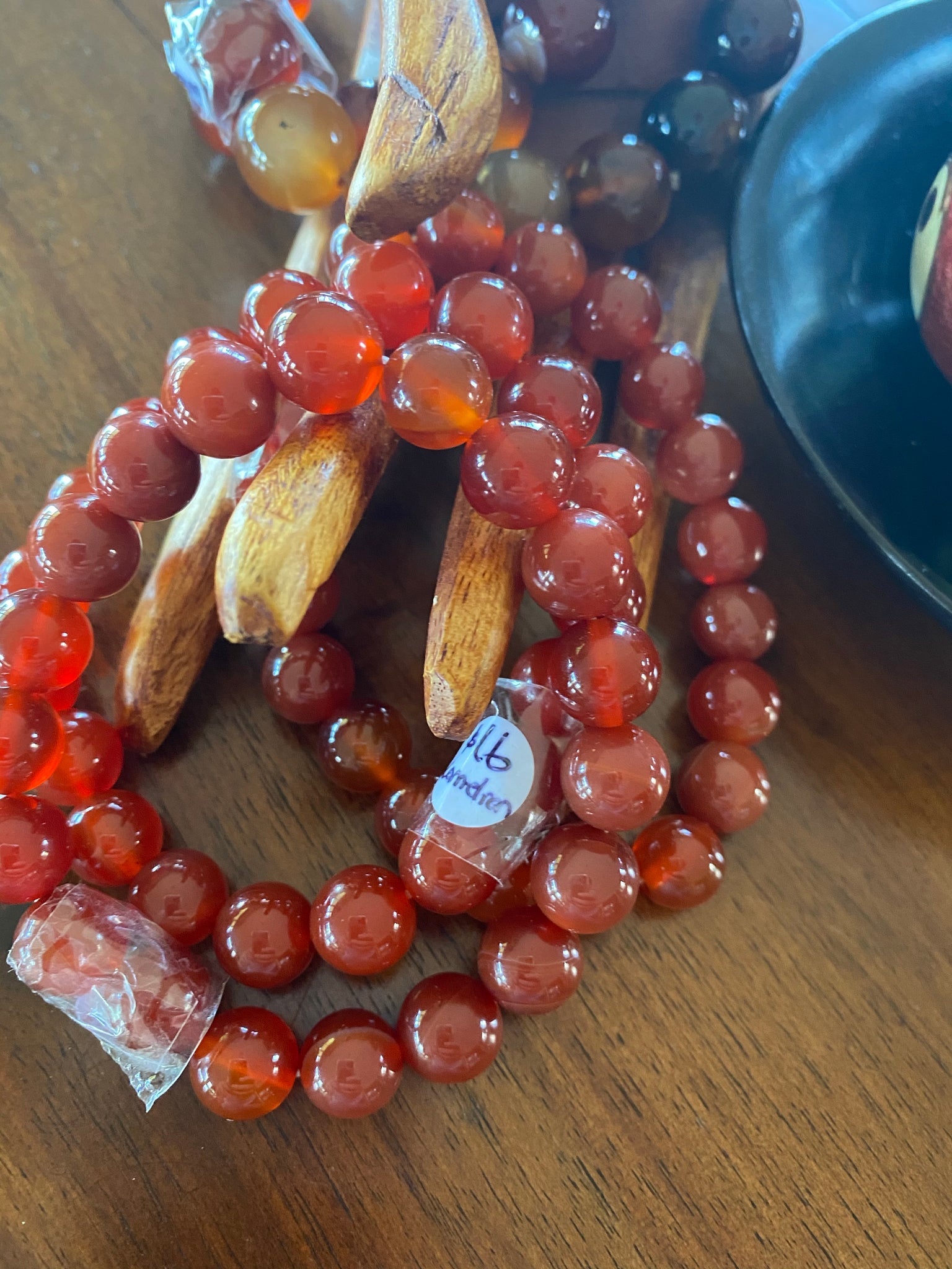 These warming, excellent quality polished Carnelian beaded bracelets are silky smooth to touch and displays a full range of different shades of orange.
