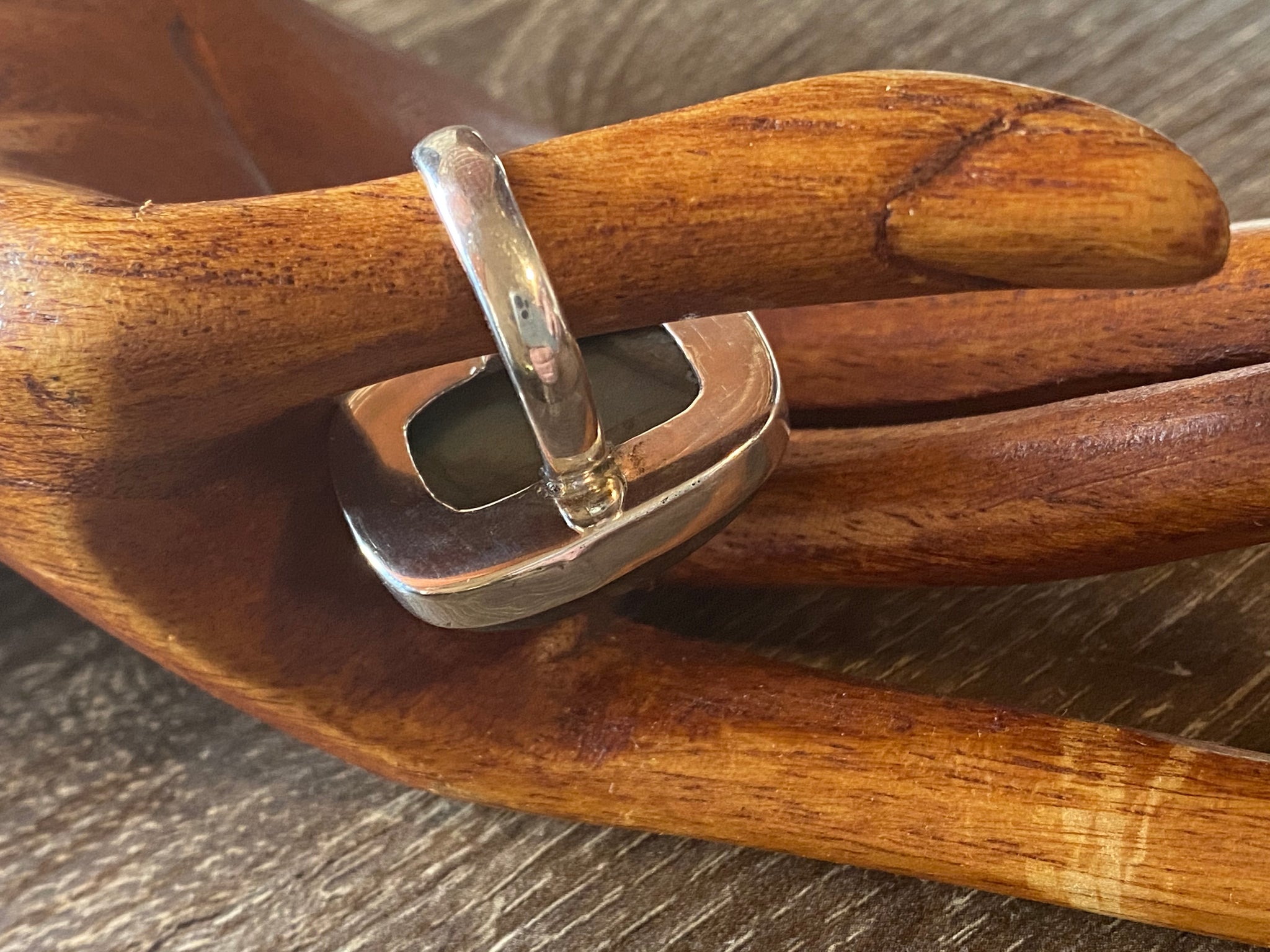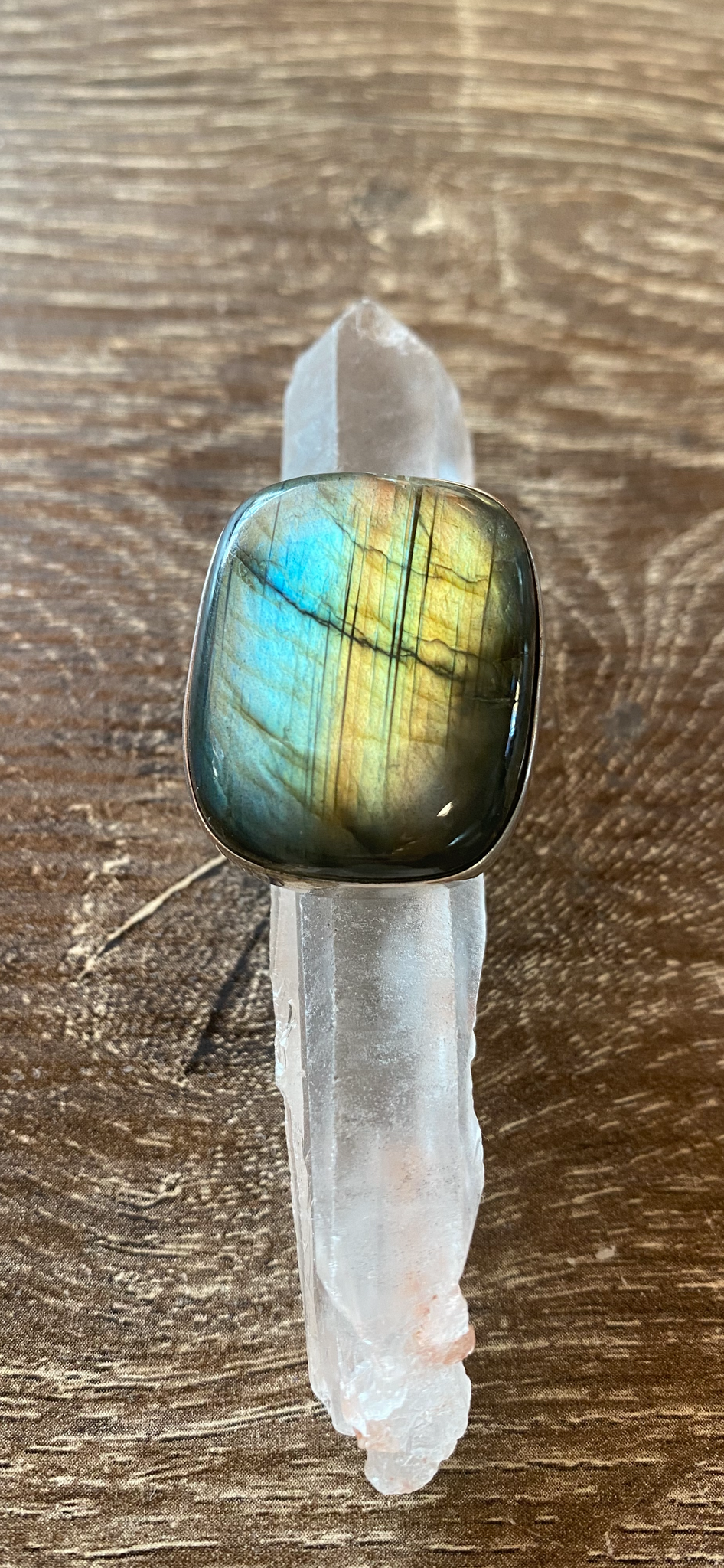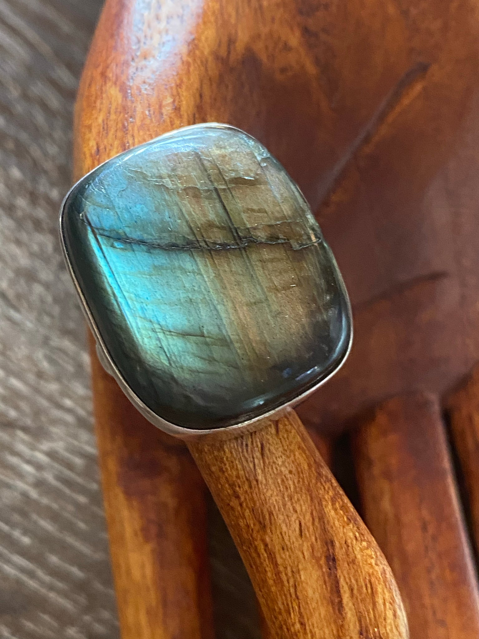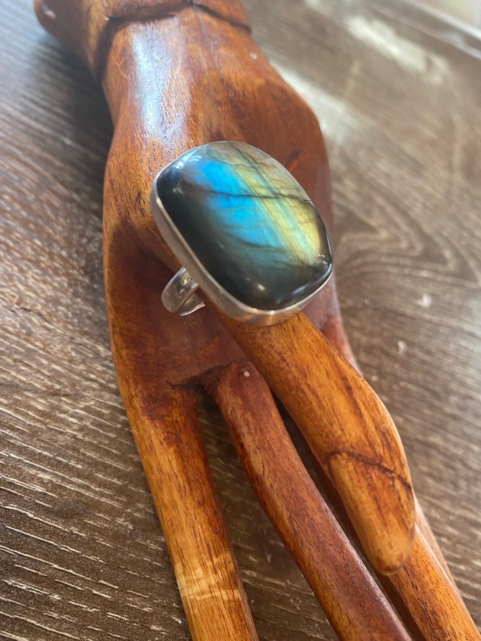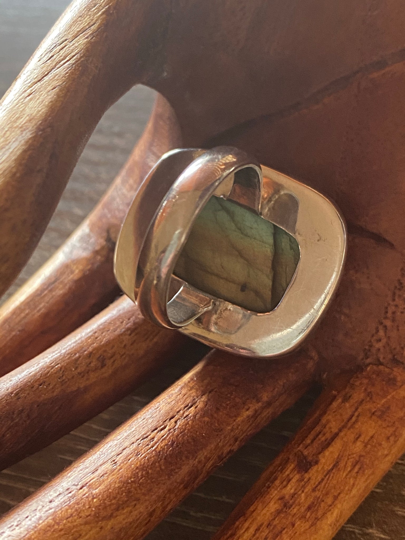 This Labradorite ring is set in sterling silver, a solid formation weighing 14.2 grams and measuring 3 cm long x 2.4 cm wide and a size 8.