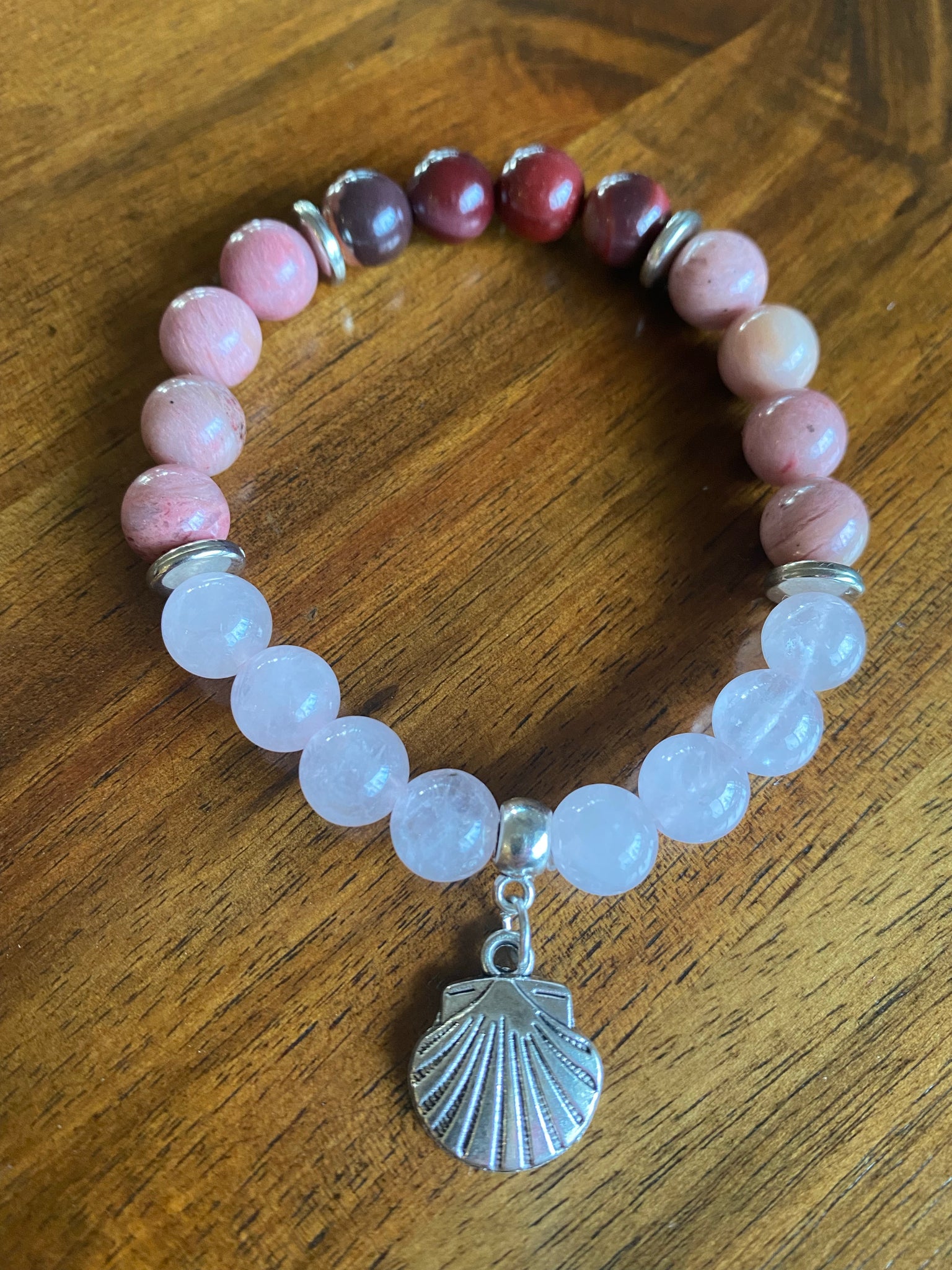 All the pink rays. These pretties are made of Mookite Jasper, Morganite and Rose Quartz with a pretty shell to sooth those emotions.