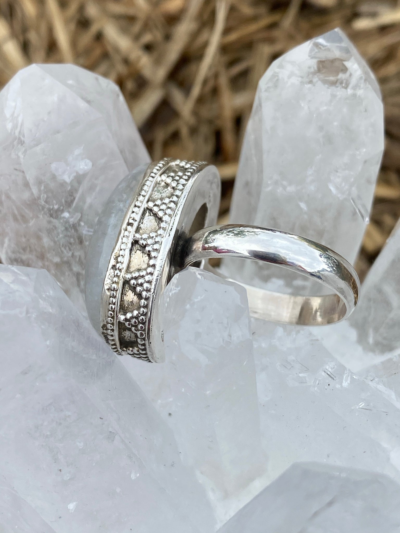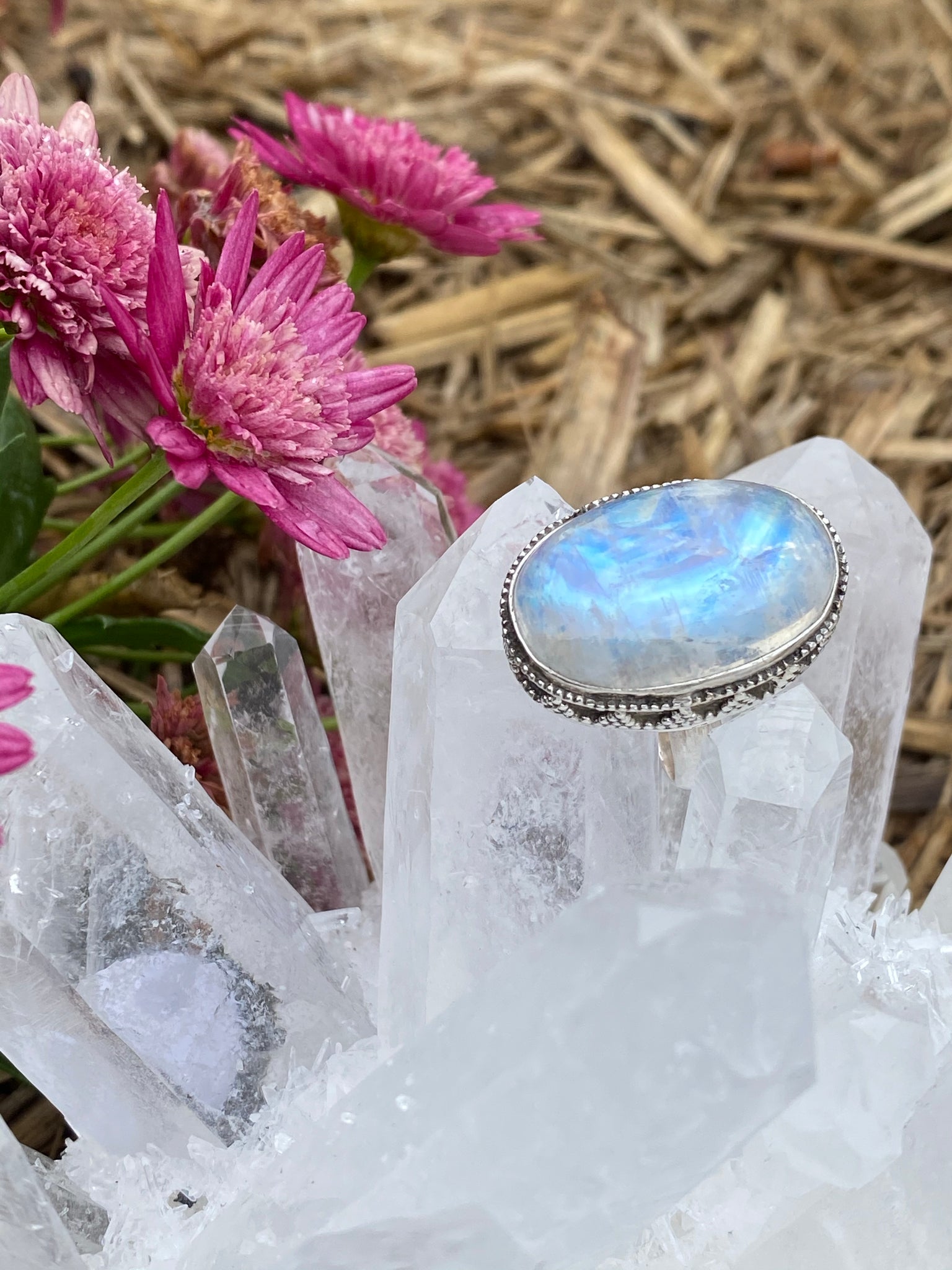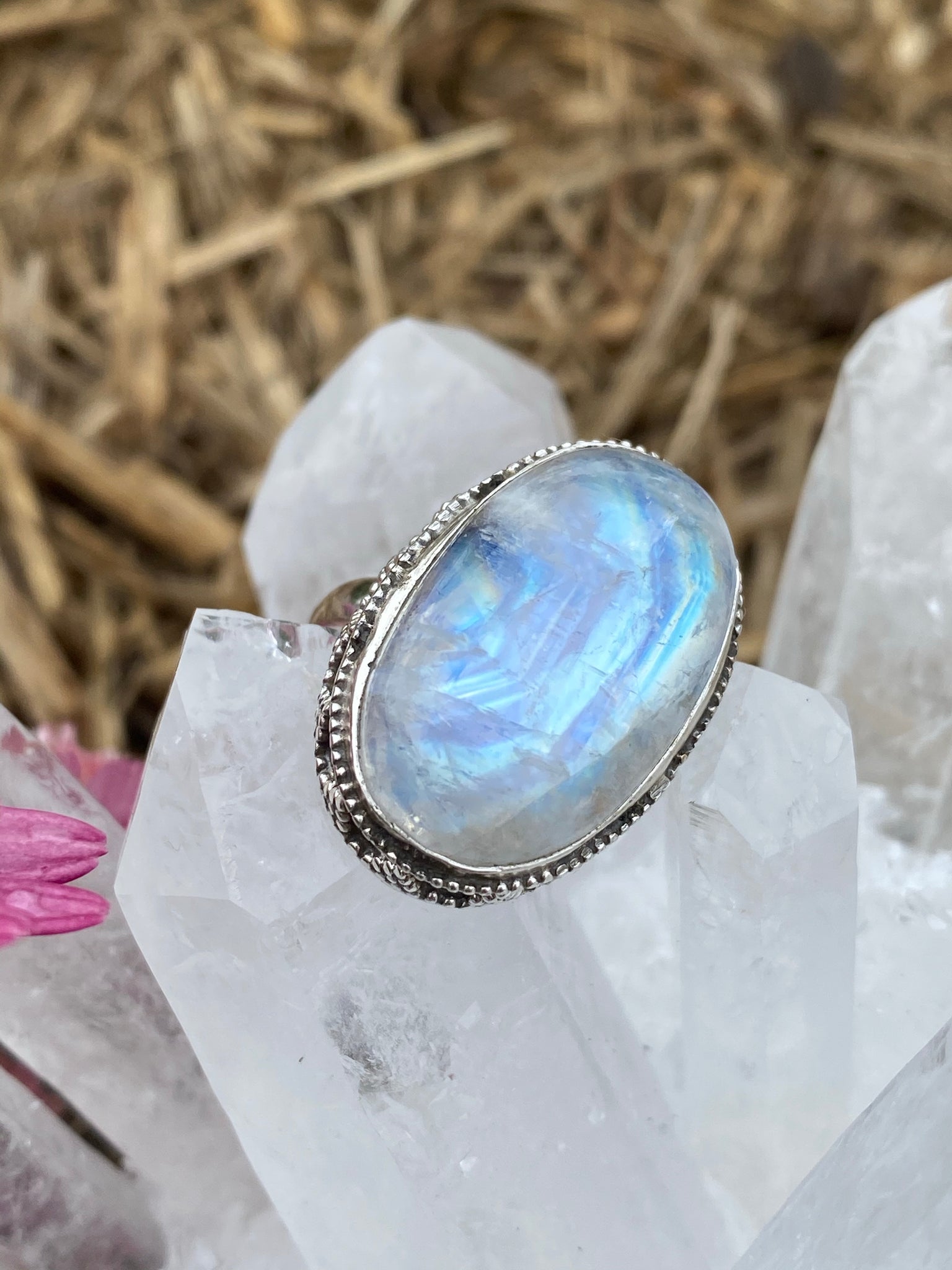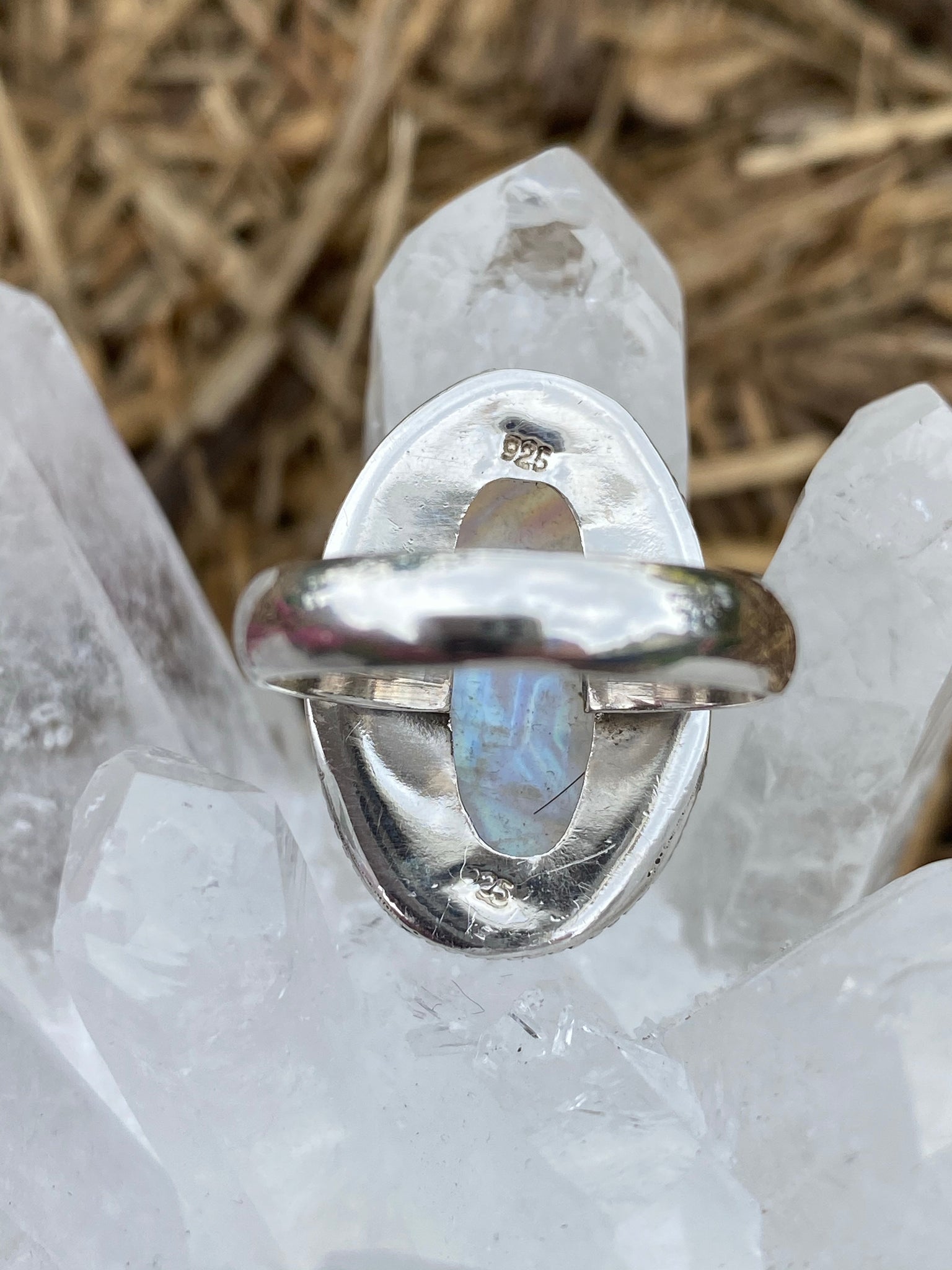 Oh My this Rainbow Moonstone ring is seriously beautiful, set in Sterling Silver and is a size 8.5.