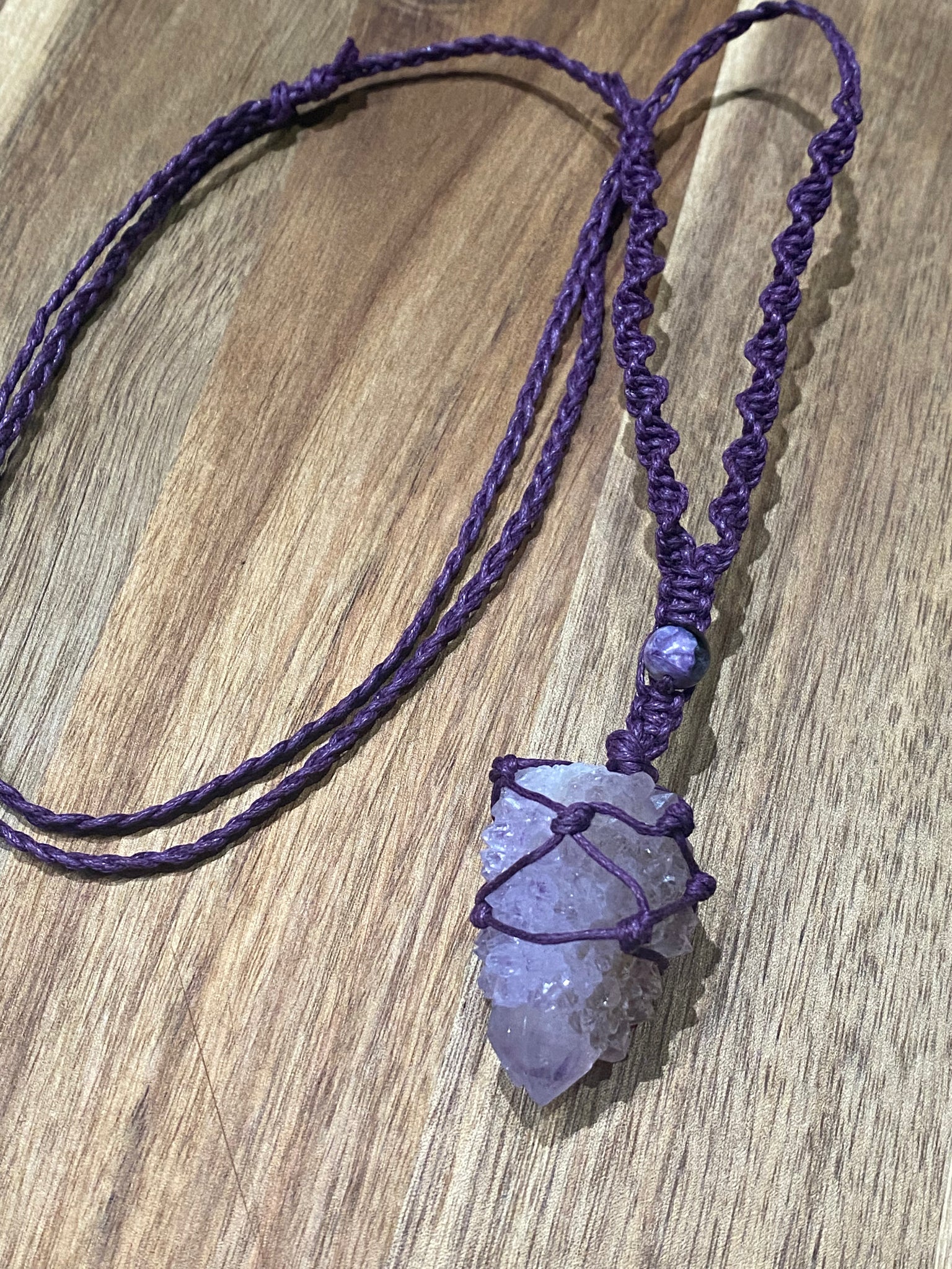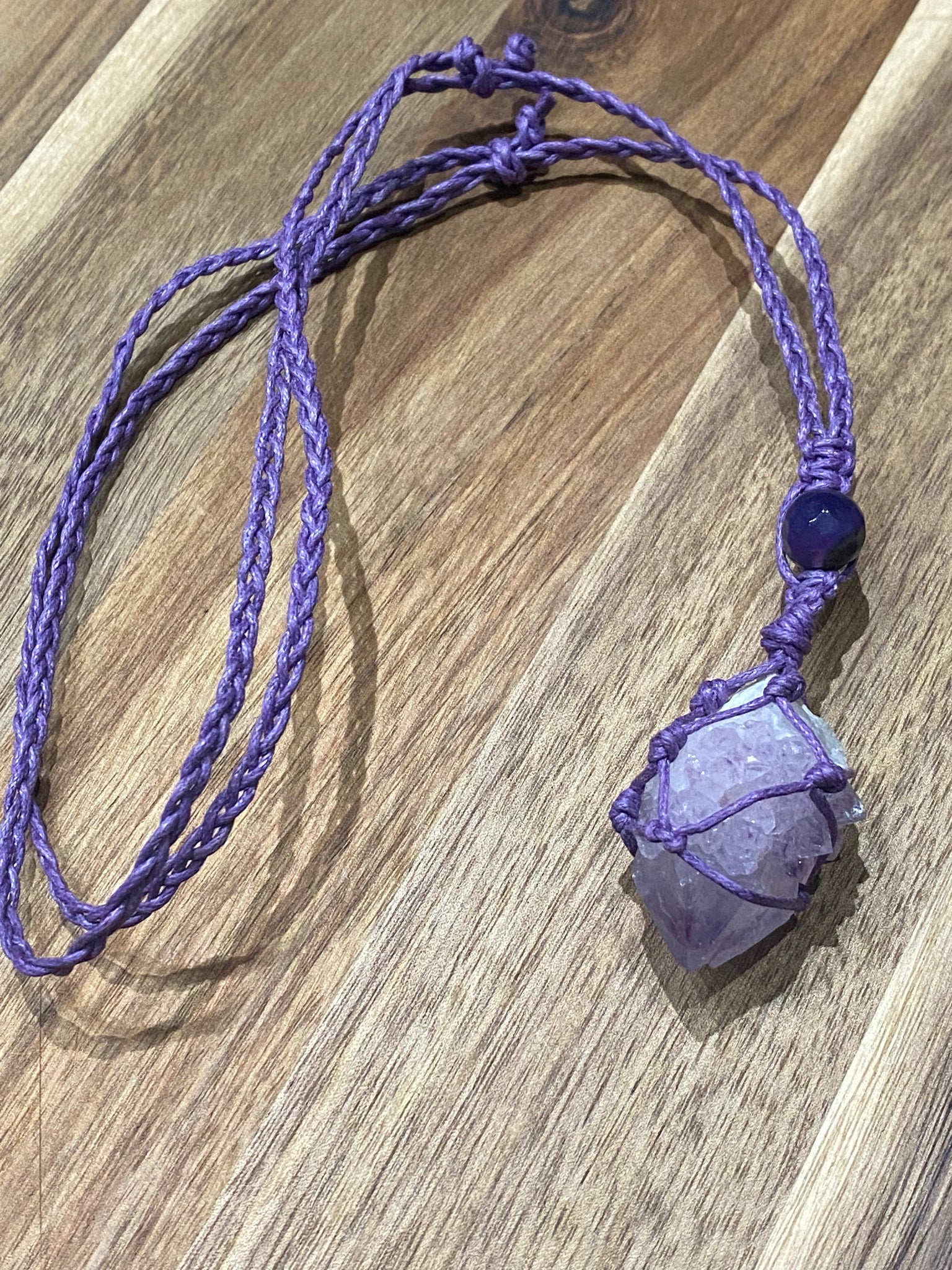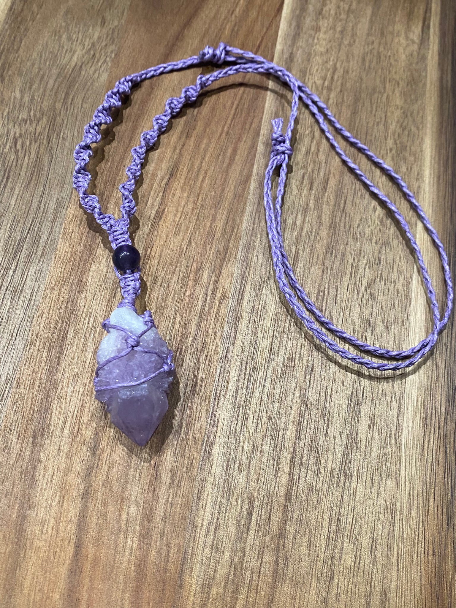 These Spirit Quartz Necklace are uniquely different. Each one a different shade of purple cord and a different type of crystal bead.
