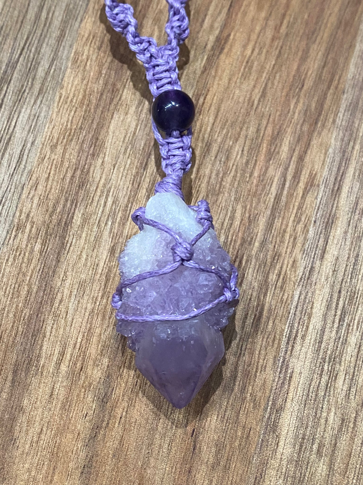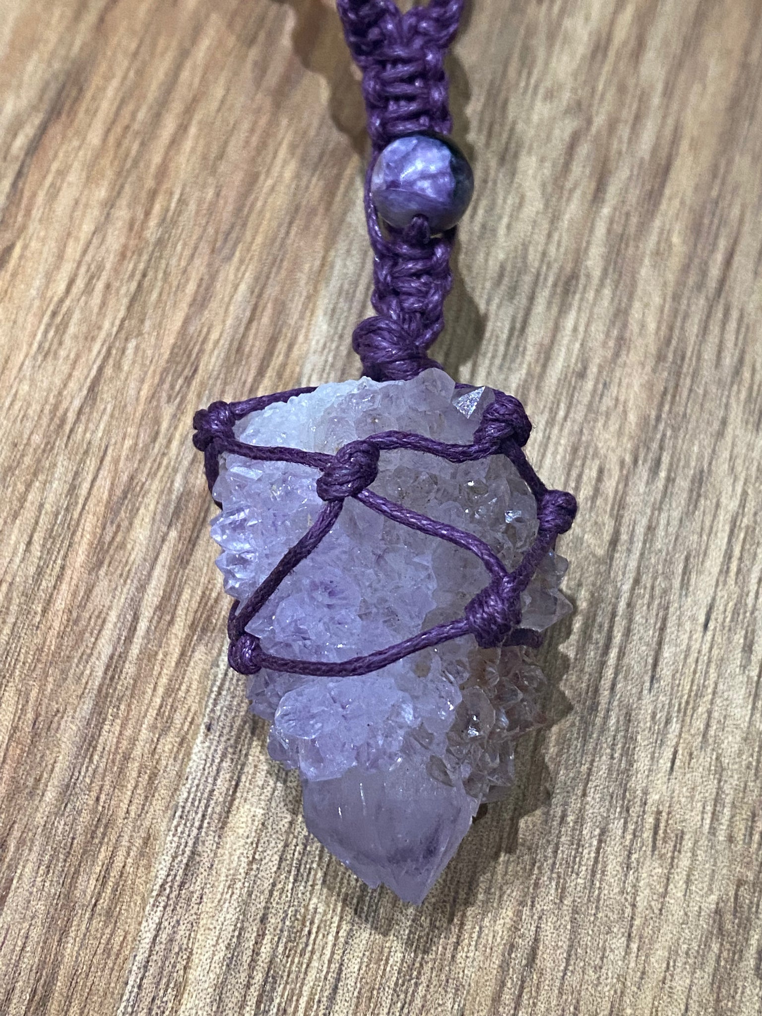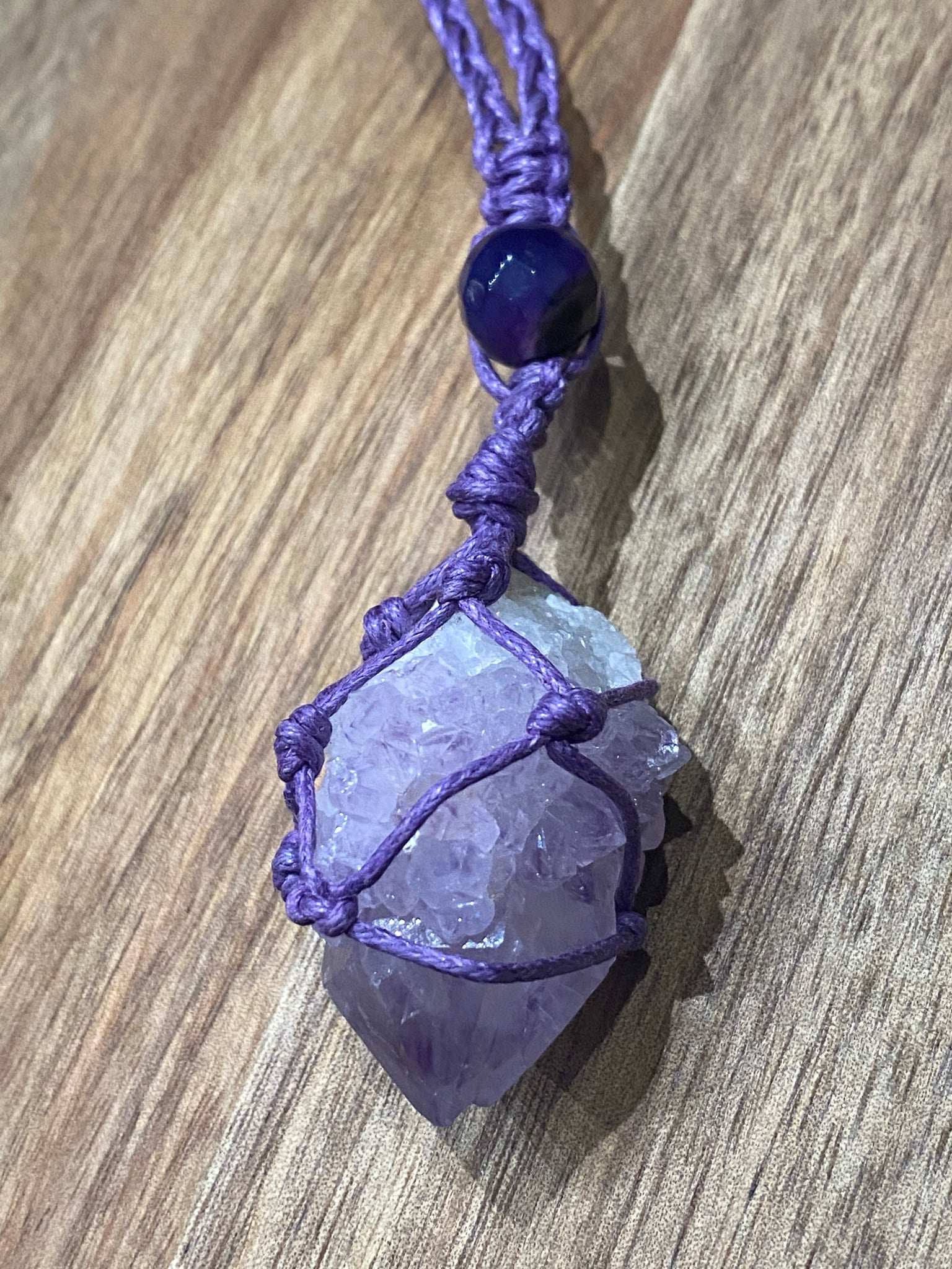 These Spirit Quartz Necklace are uniquely different. Each one a different shade of purple cord and a different type of crystal bead.