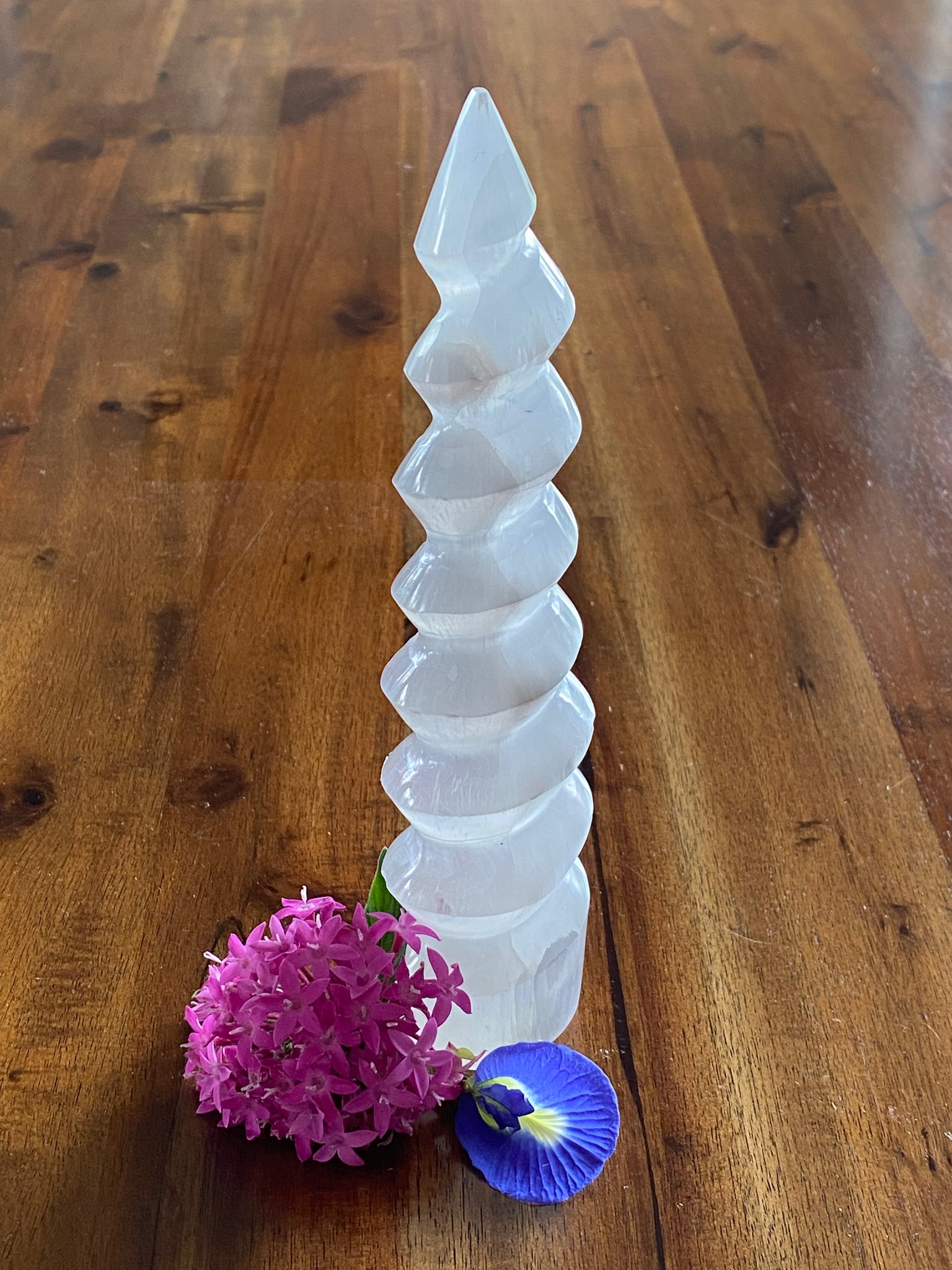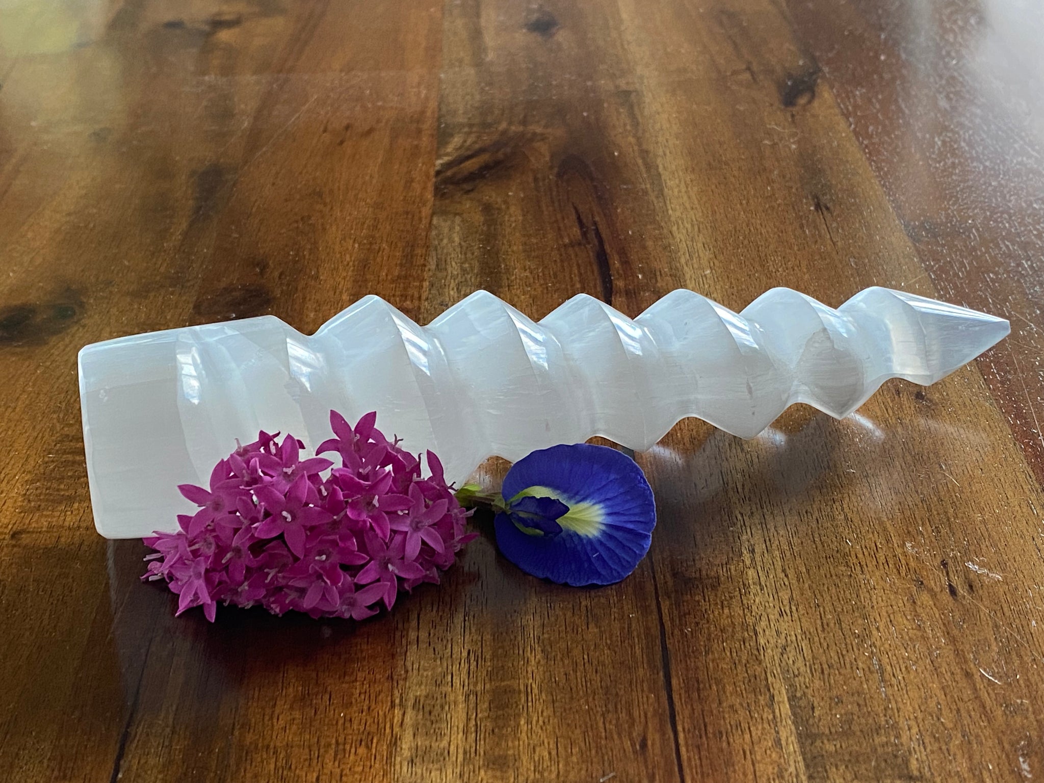 Selenite can assist in the acquisition of material needs in business. Providing flexibility and strengthening ones decisions. Assisting in justice, lessening assumption, reconnecting the conscious self with the higher self.