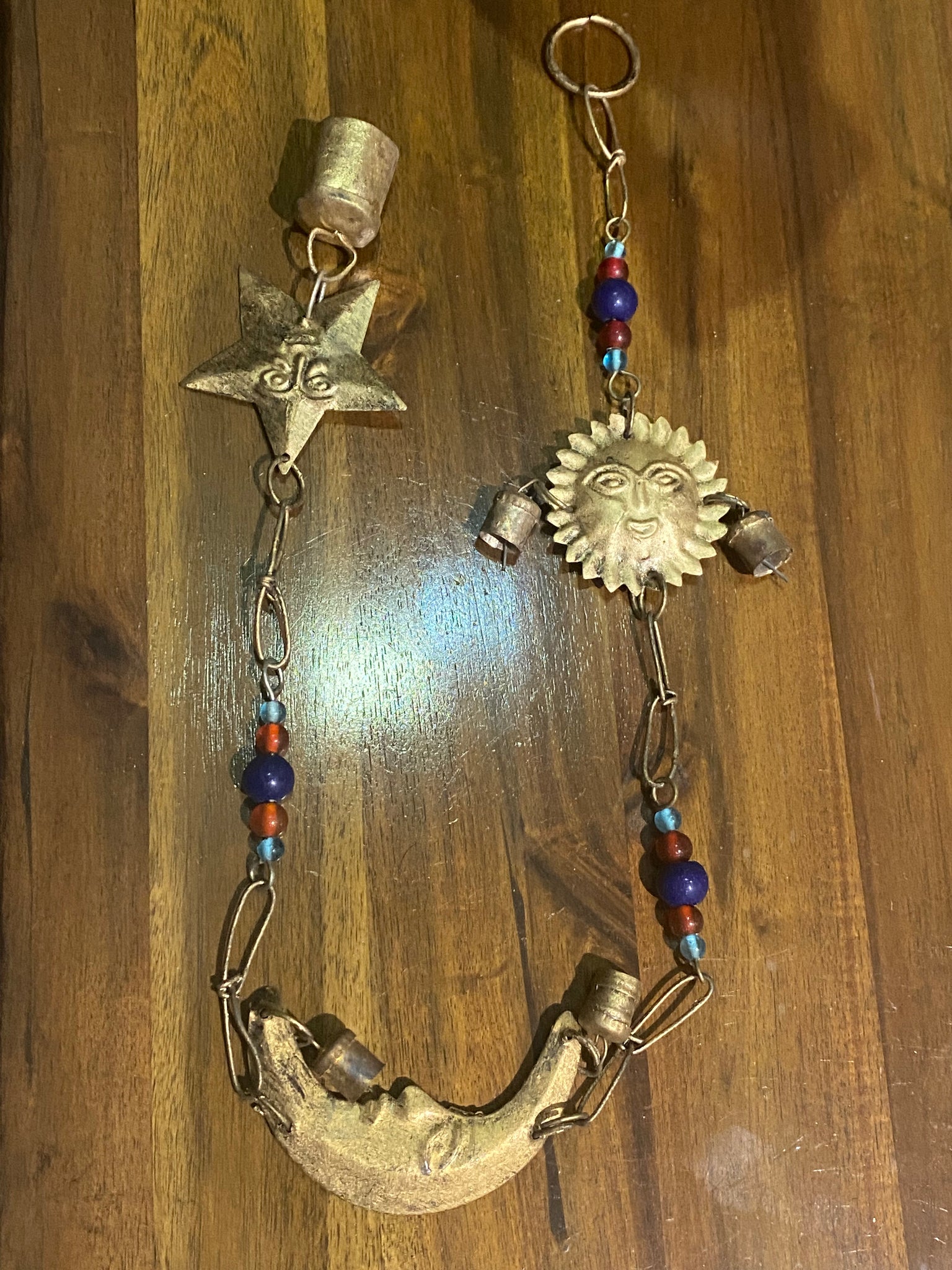Decorated with multi coloured beads and cow bells. Perfect for the veranda, doorway or gardens.